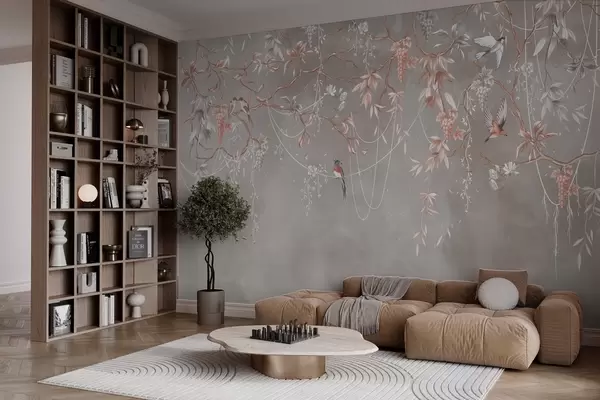 Фотошпалери Гілки з виноградом і птахами на теплому сіро-рожевому тлі w04302