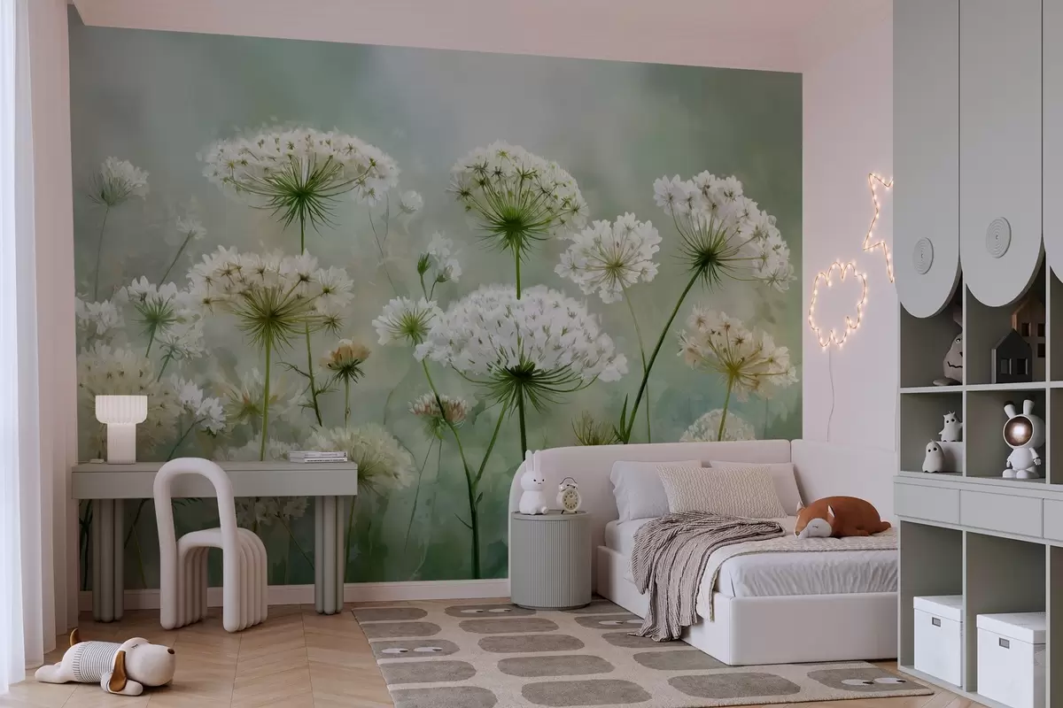 Фотошпалери ніжні білі польові квіти королеви Анни, в мальовничому стилі, зелені тони w04313