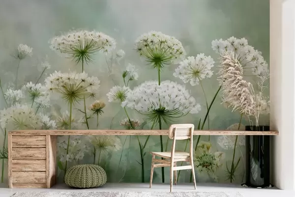 Фотошпалери ніжні білі польові квіти королеви Анни, в мальовничому стилі, зелені тони w04313