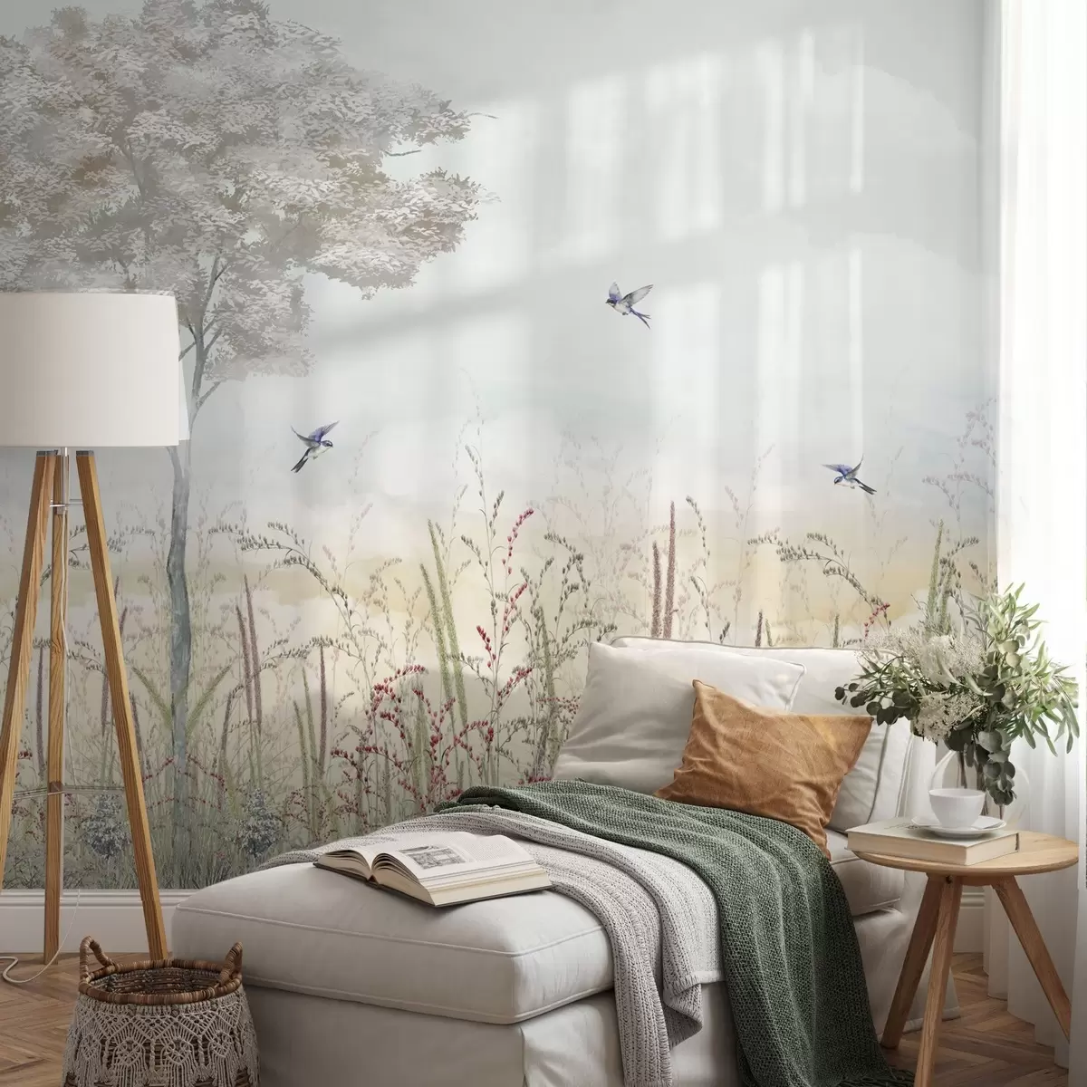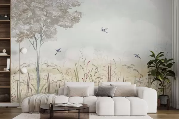 Фотошпалери Пейзаж з деревом, птахами та луговими травами w04350