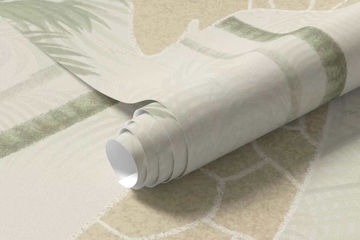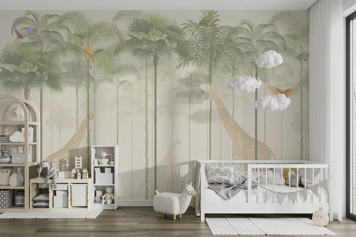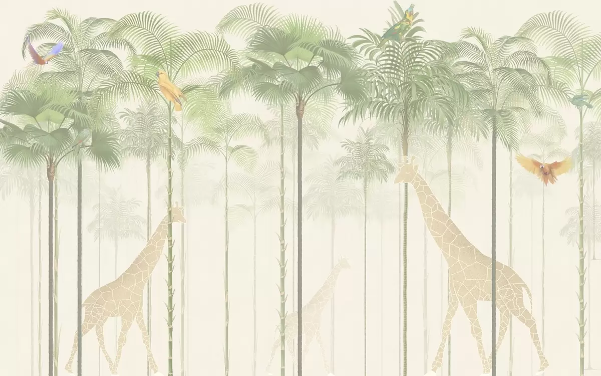 Фотошпалери Жирафи і тропічні птахи серед високих пальм w04400