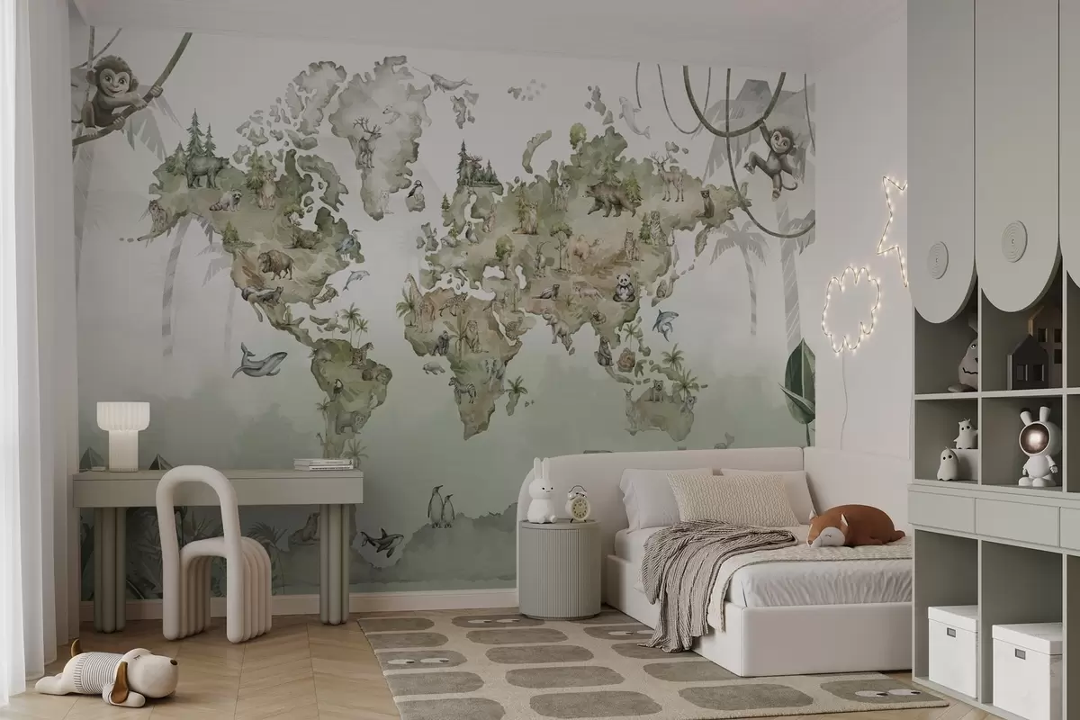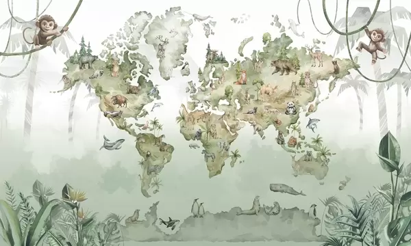 Фотошпалери Ілюстрована карта світу з тваринами та джунглями w04418v1
