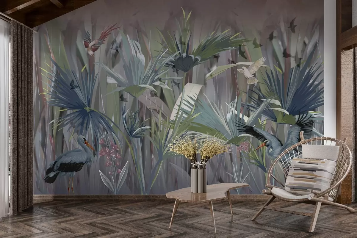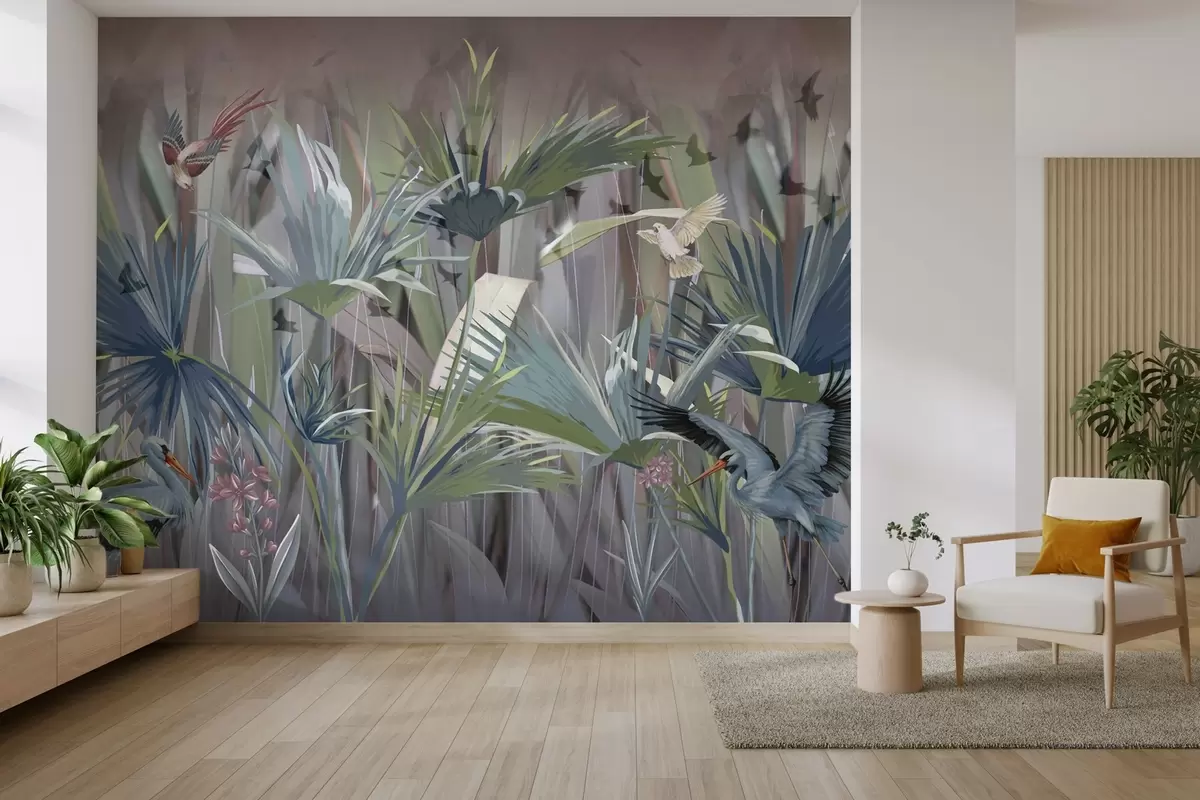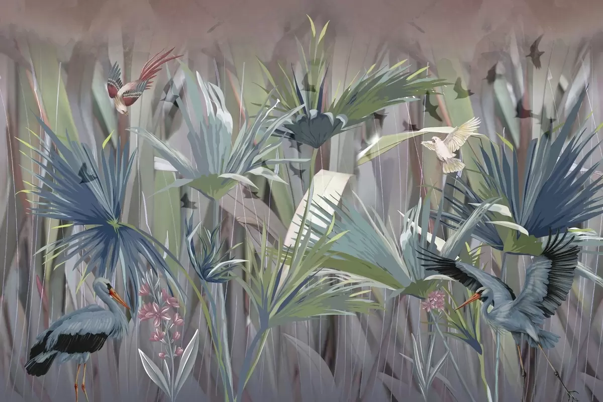 Фотошпалери Екзотичні птахи серед пальмового листя та квітів w04458