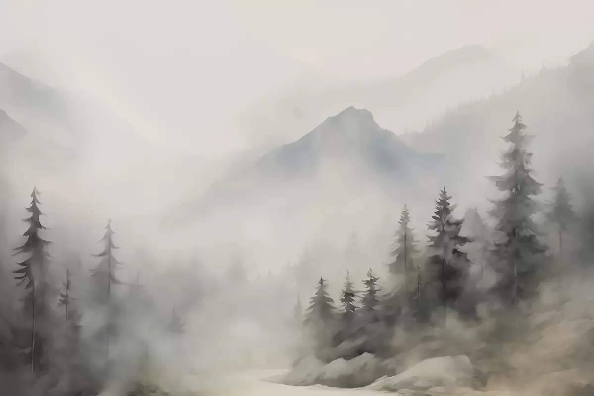 Фотошпалери Ліс у тумані на тлі гір w04493