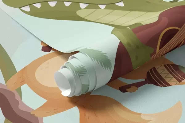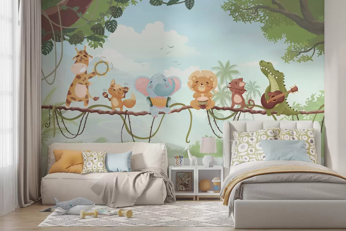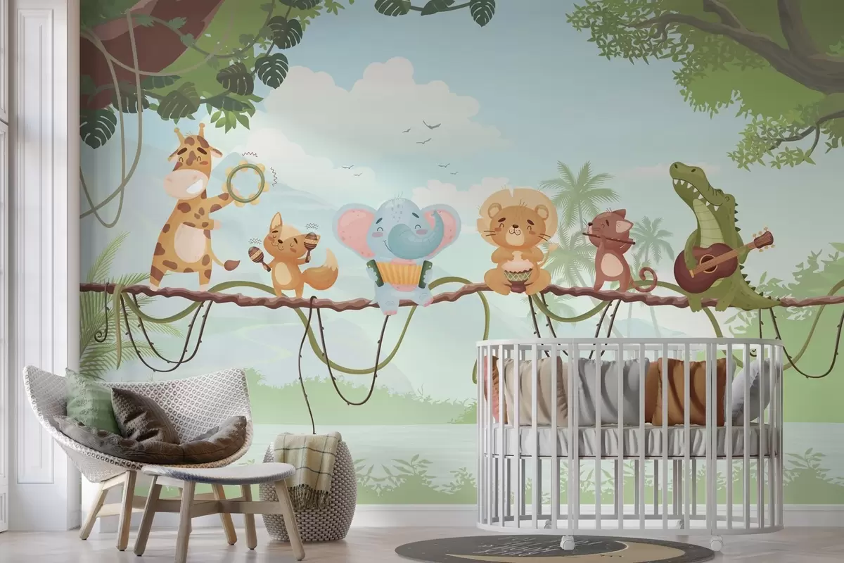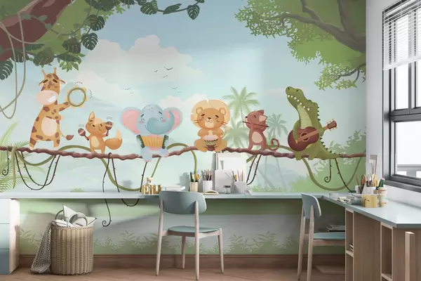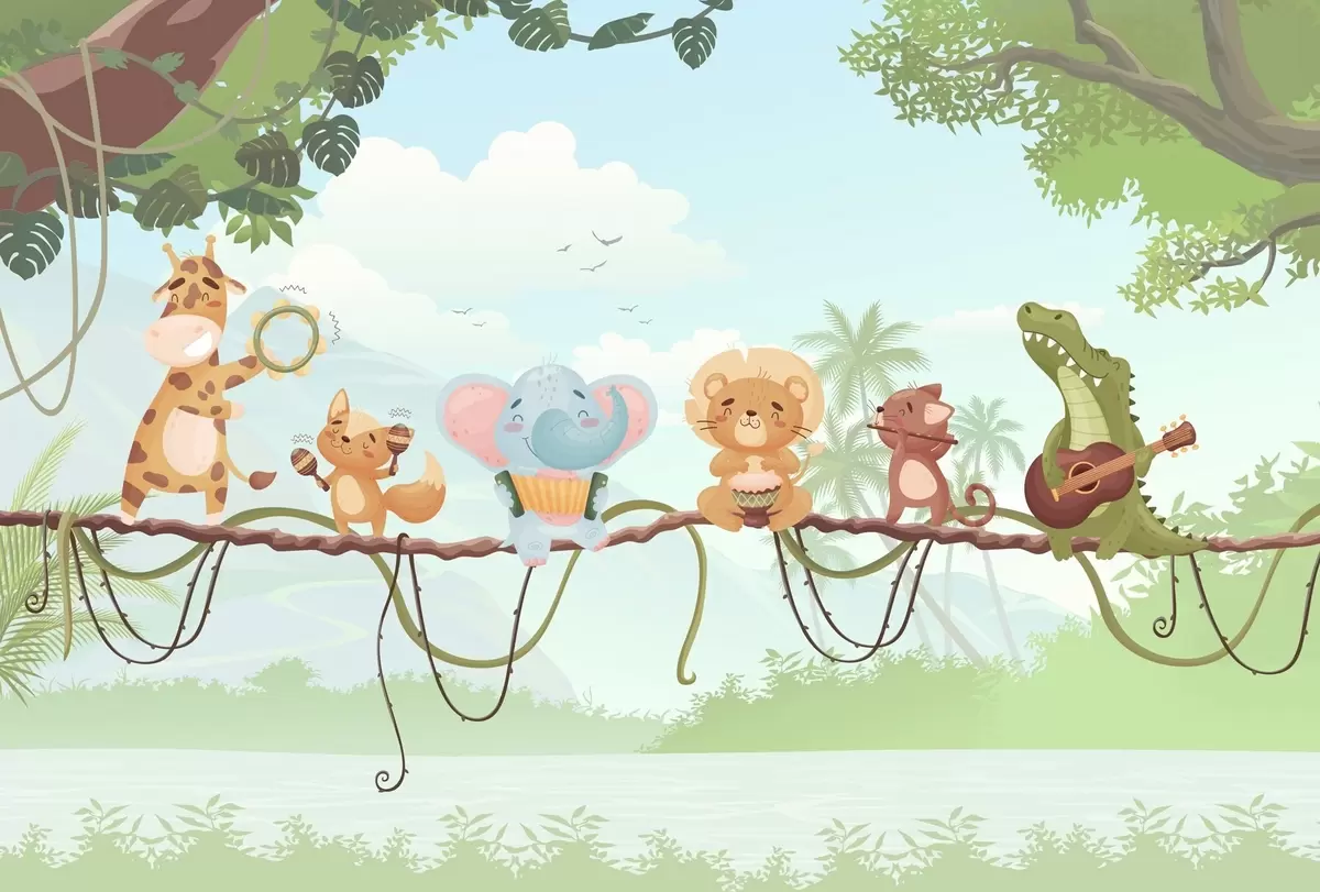 Фотошпалери Тварини з музичними інструментами на тлі тропічного пейзажу w04505