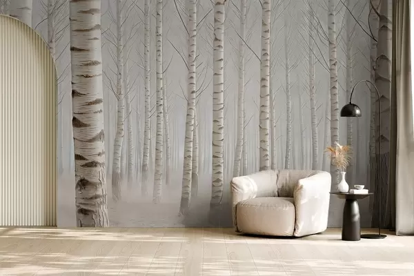 Фотошпалери Березовий ліс у тумані, світлий мінімалізм w04574