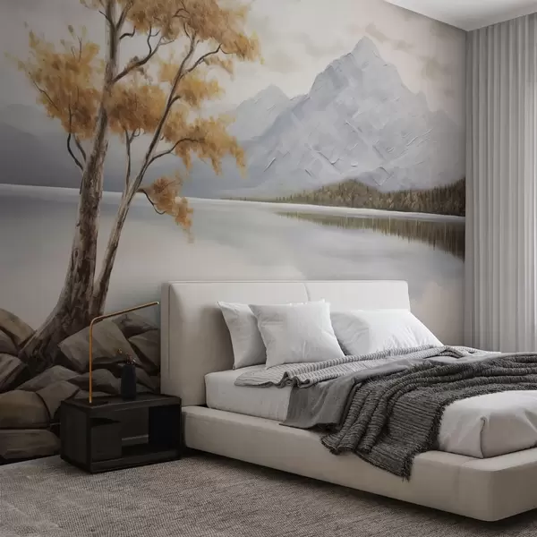Фотошпалери Осіннє дерево біля гірського озера, спокійні пастельні тони w04611