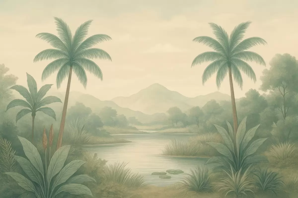 Фотошпалери тропічний пейзаж з пальмами і річкою w04623