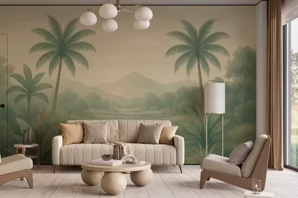 Шпалери тропічний пейзаж з пальмами і річкою w04623