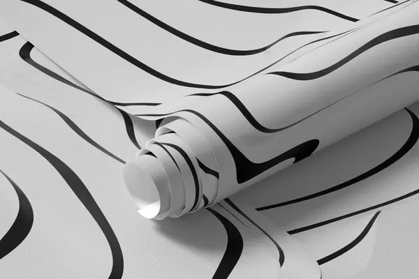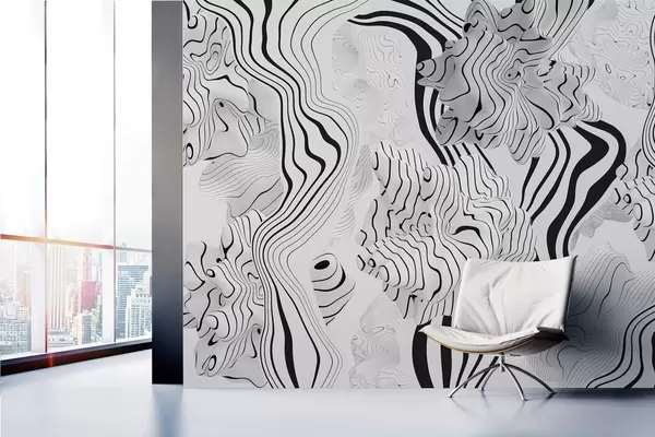 Фотошпалери абстрактні органічні форми в 3D-стилі в білих і сірих тонах з чорними смугами w04627