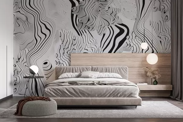 Фотошпалери абстрактні органічні форми в 3D-стилі в білих і сірих тонах з чорними смугами w04627