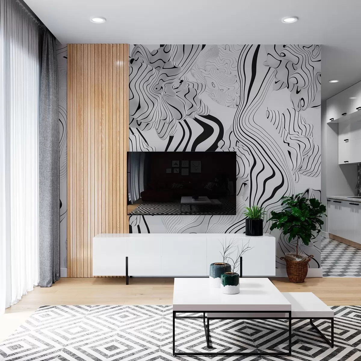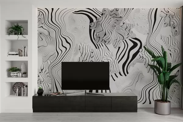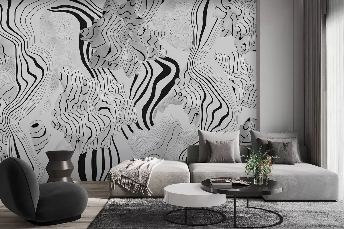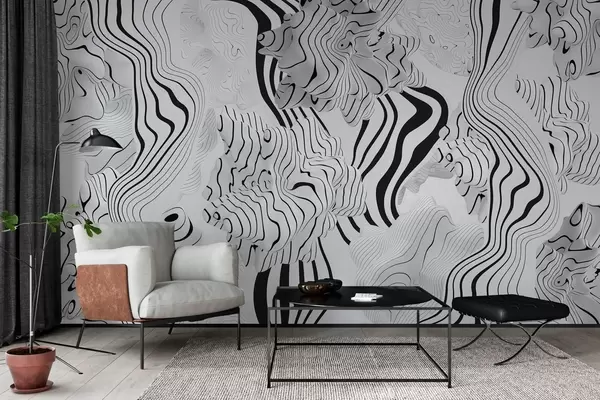 Фотошпалери абстрактні органічні форми в 3D-стилі в білих і сірих тонах з чорними смугами w04627