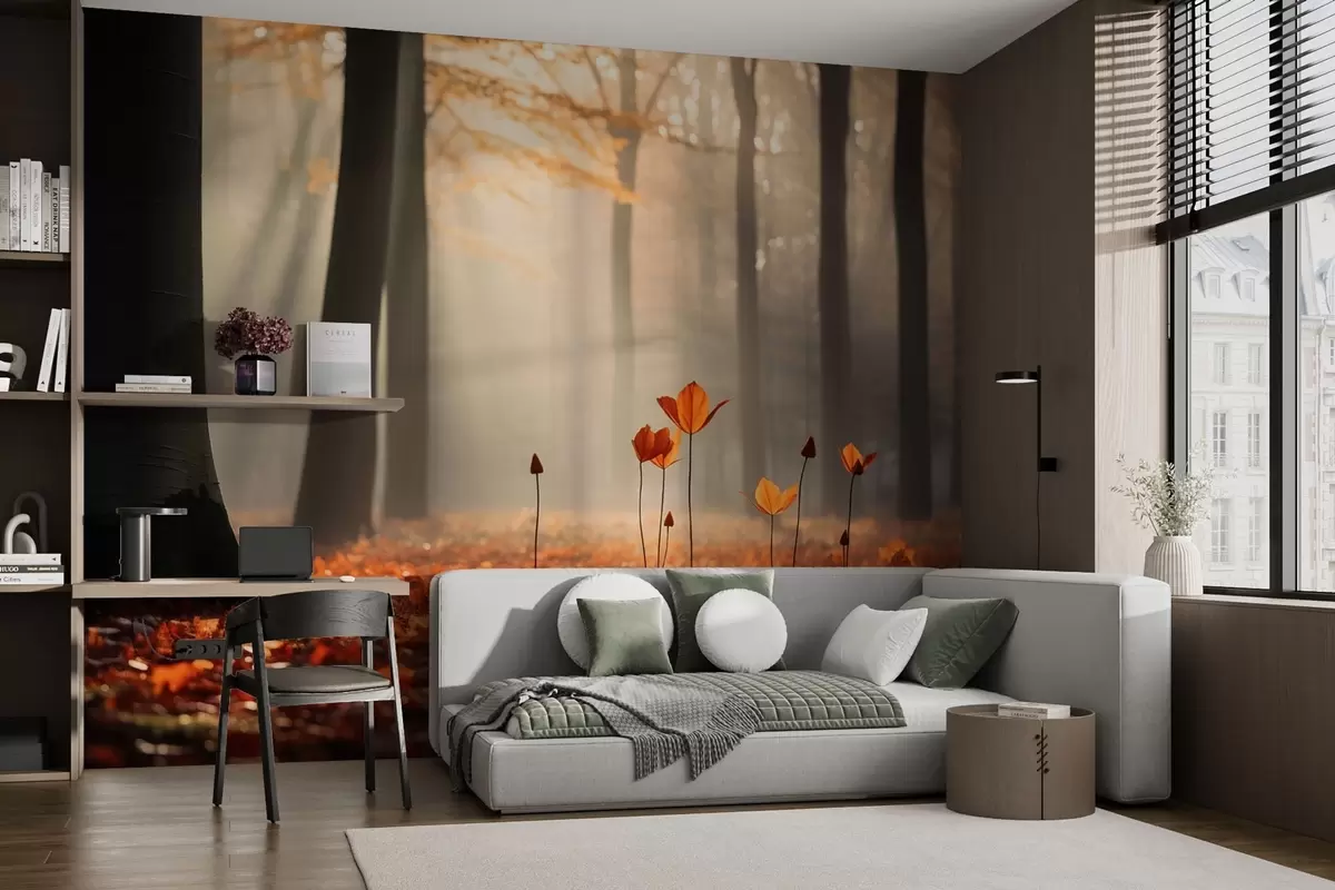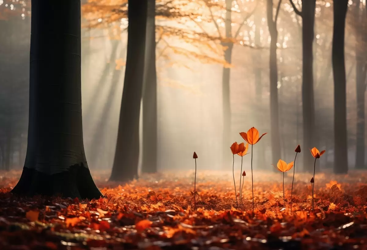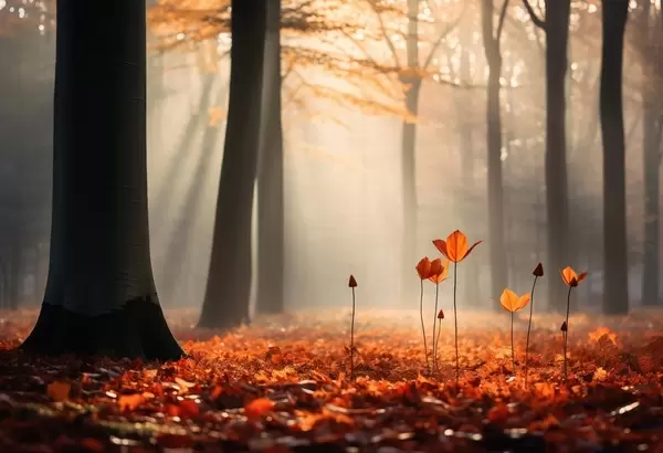 Фотошпалери Осінній ліс з сонячними променями і яскравим листям w04710
