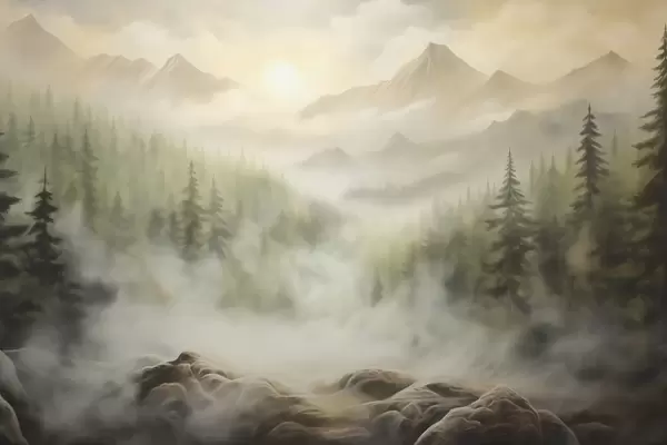 Фотошпалери Ліс у тумані на тлі гір w04730