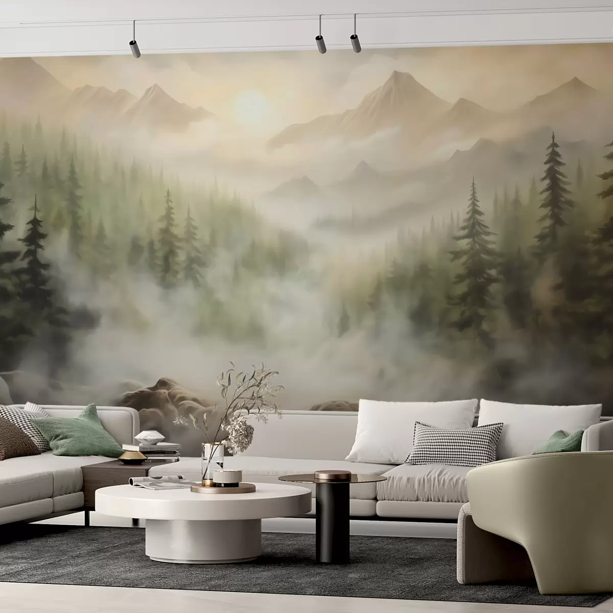 Фотошпалери Ліс у тумані на тлі гір w04730