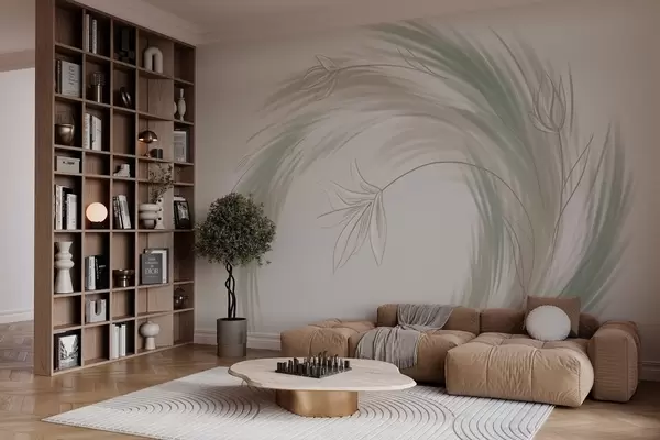 Фотошпалери зелені та бежеві пір'я та квіти, розписані вручну w04816