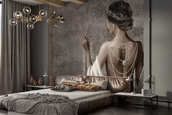 Фотошпалери Жінка, побачена ззаду, з перлами, сірий фон з візерунком каменю w04854