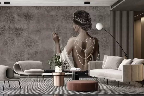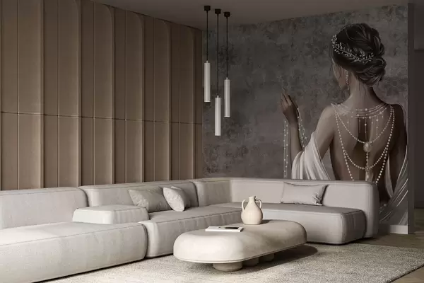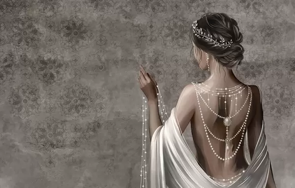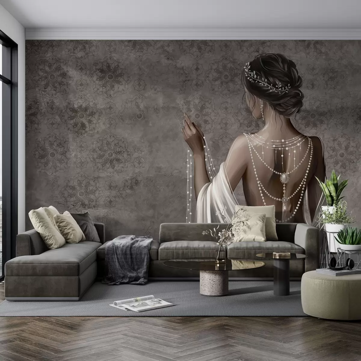 Фотошпалери Жінка, побачена ззаду, з перлами, сірий фон з візерунком каменю w04854