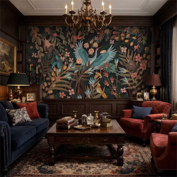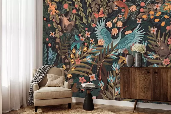Фотошпалери Фантастична сцена з птахами і тваринами серед рослин w05024