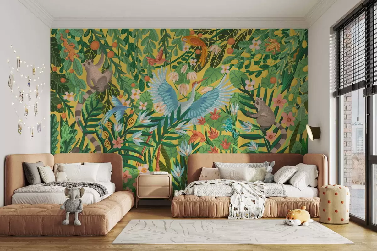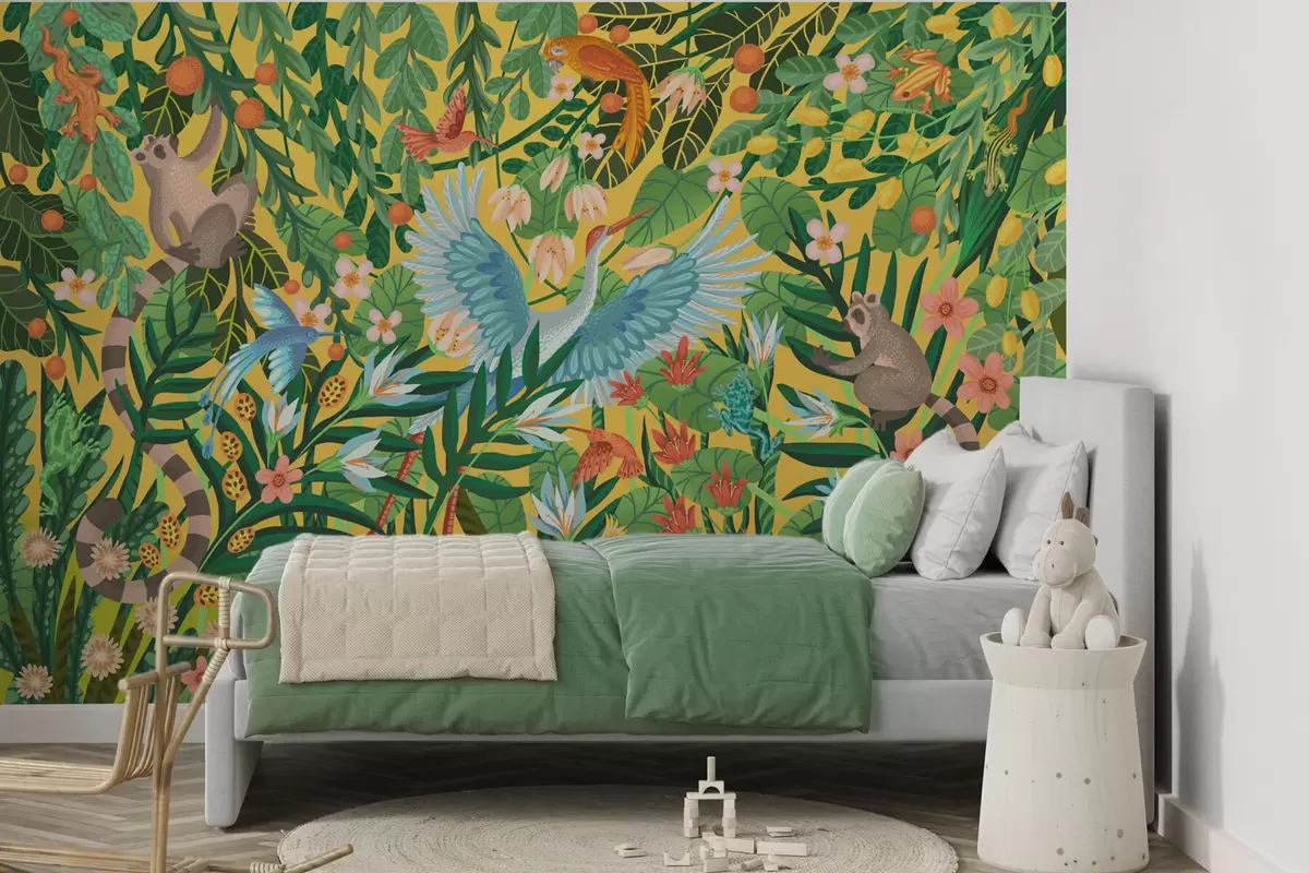 Фотошпалери Яскрава сцена з птахами і тваринами в густій зелені w05024v1