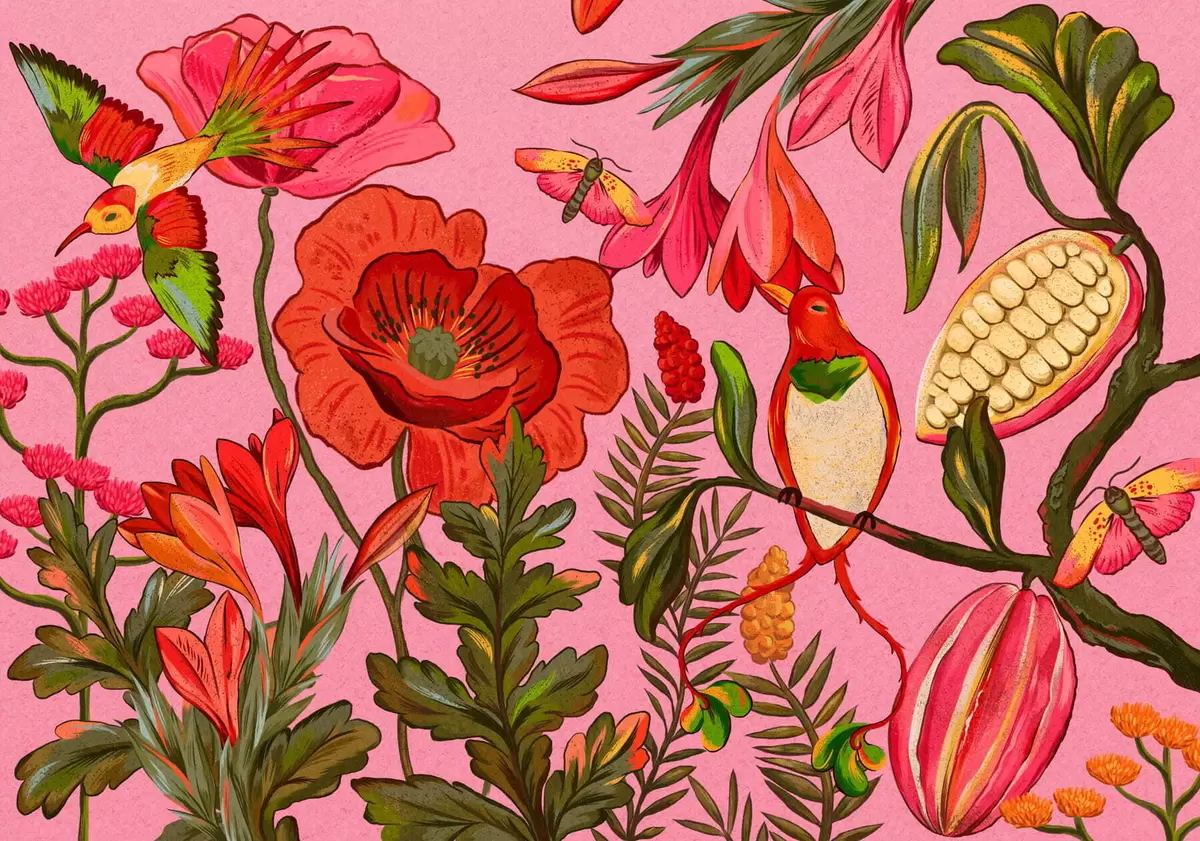 Фотошпалери Декоративні квіти та птахи на рожевому тлі w05036v2