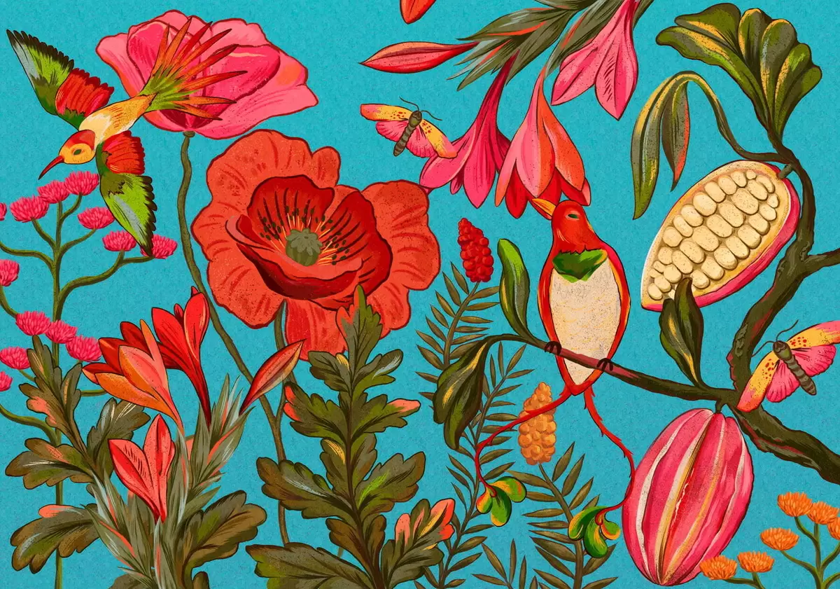 Фотошпалери Декоративні квіти та птахи на синьому тлі w05036v3