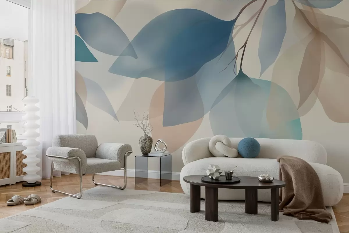 Фотошпалери елегантне напівпрозоре листя в відтінках синього та бежевого кольорів w05060