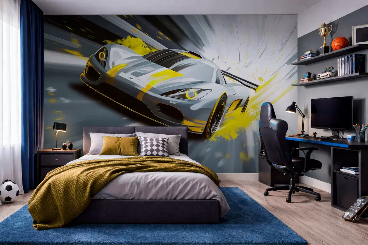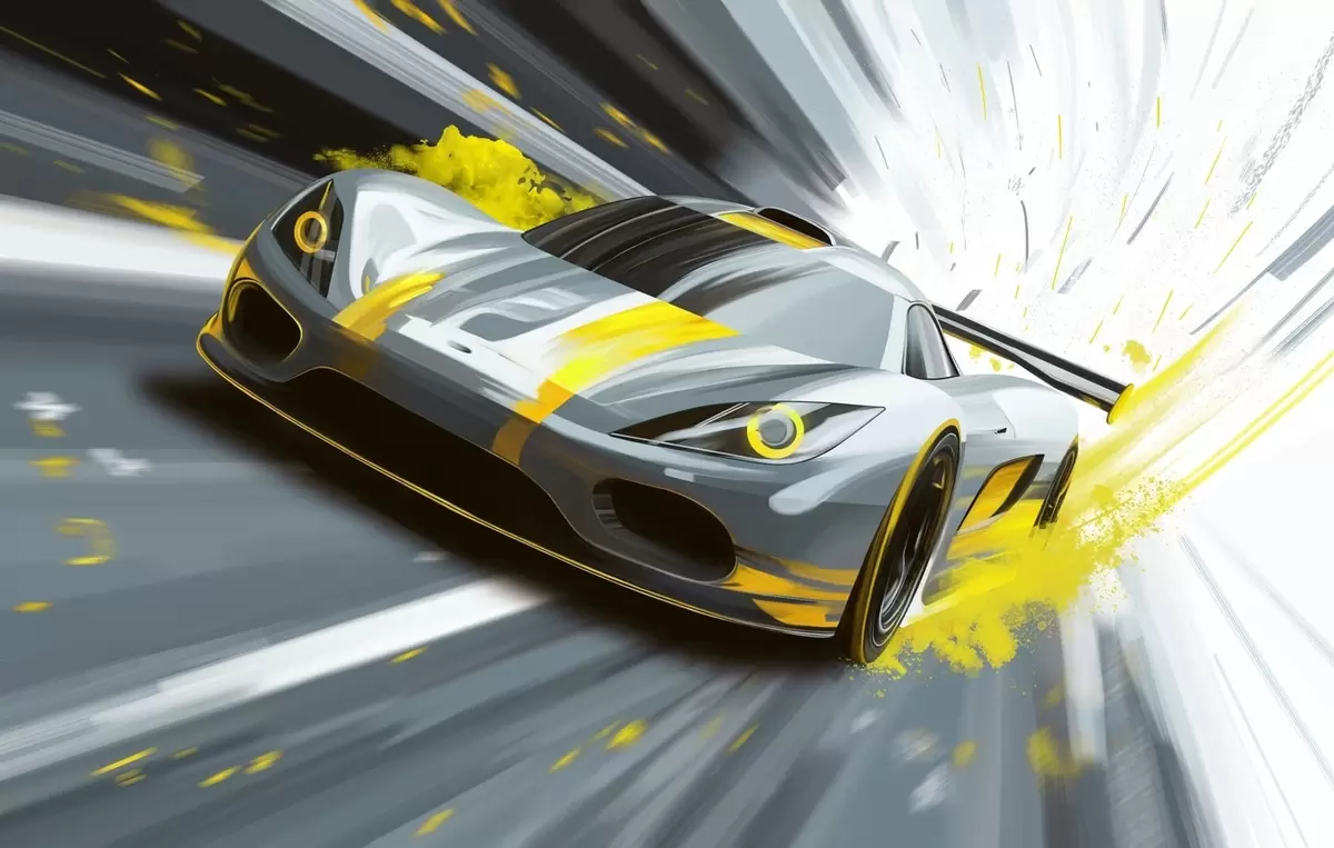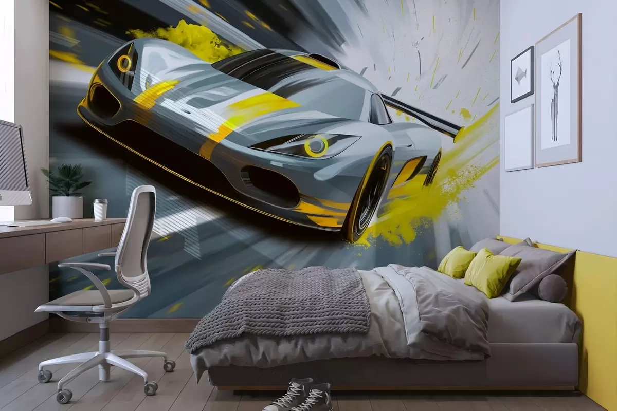 Фотошпалери динамічний спортивний автомобіль у стилі цифрового малюнка з жовтими акцентами w05069v2