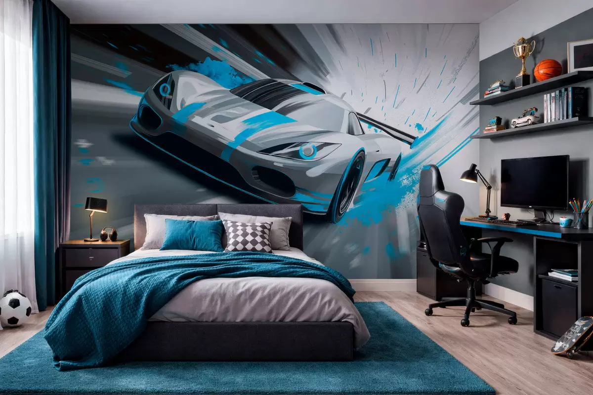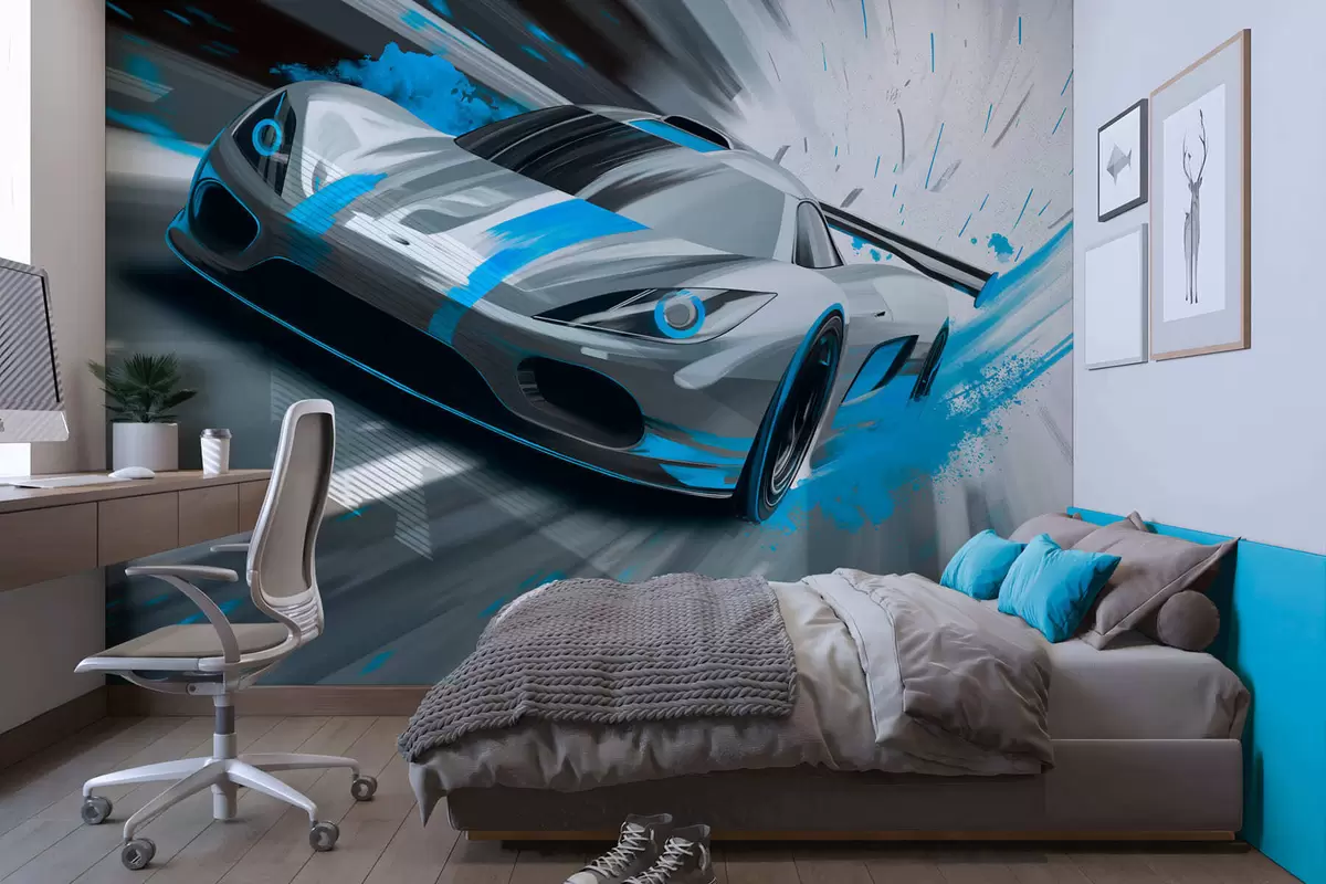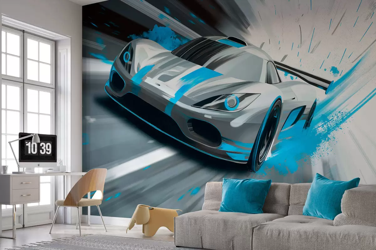 Фотошпалери динамічний спортивний автомобіль у стилі цифрового малюнка з бірюзовими акцентами w05069v3