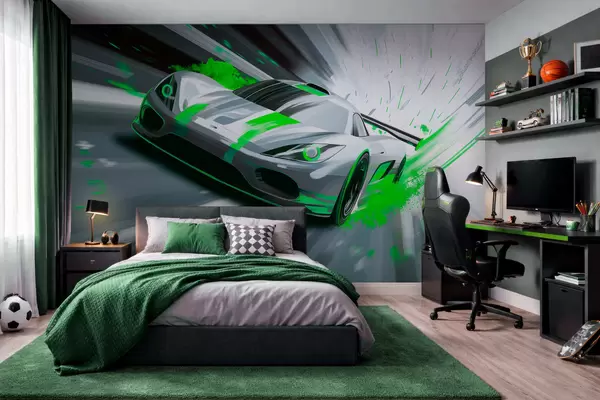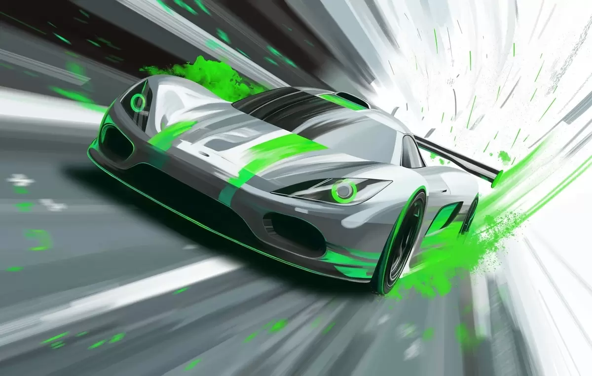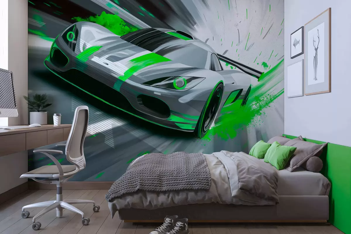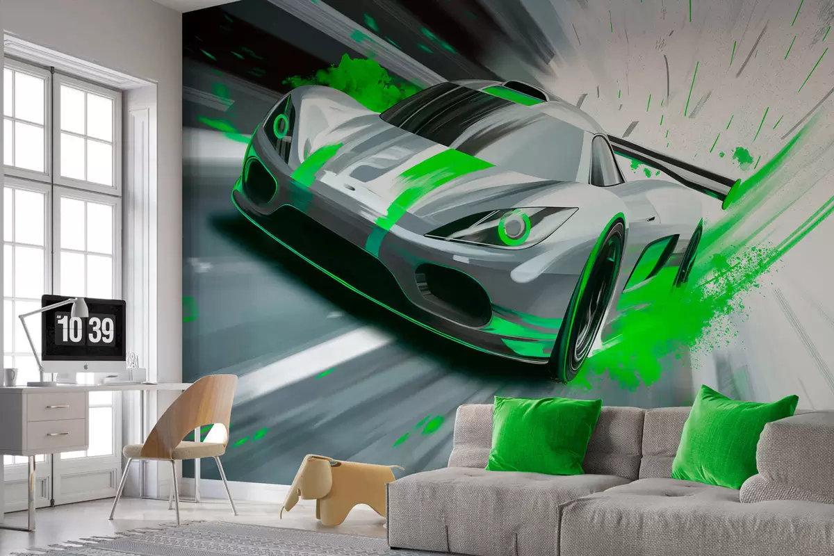 Фотошпалери динамічний спортивний автомобіль у стилі цифрового малюнка з зеленими акцентами w05069v4