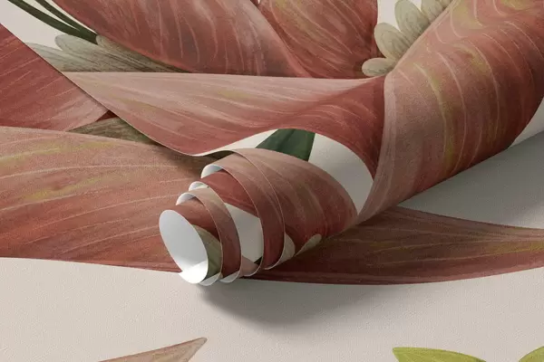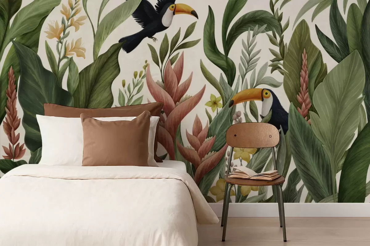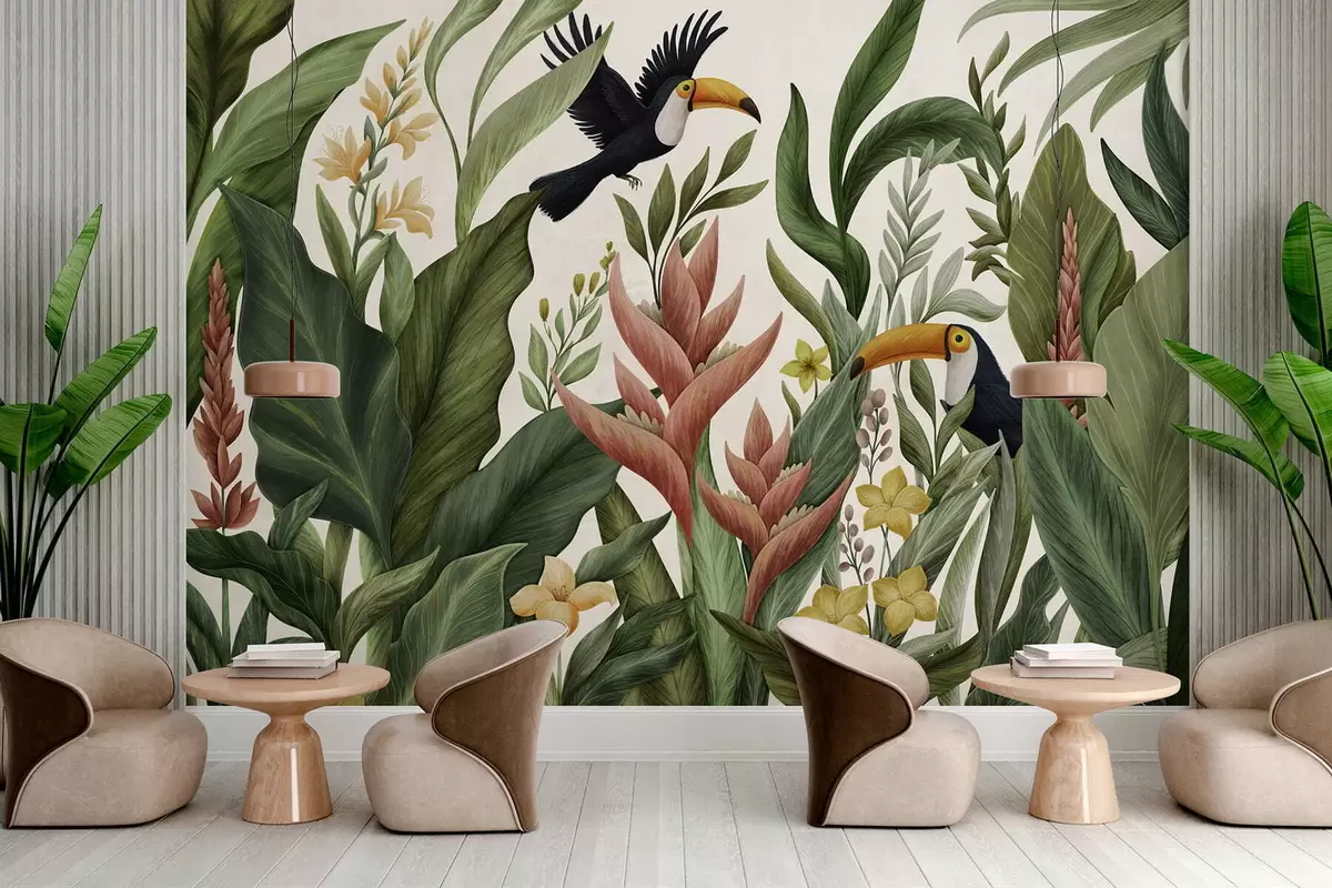 Фотошпалери Тропічні рослини та птахи з великими дзьобами на світлому тлі w05088v1