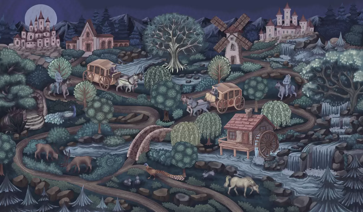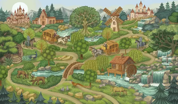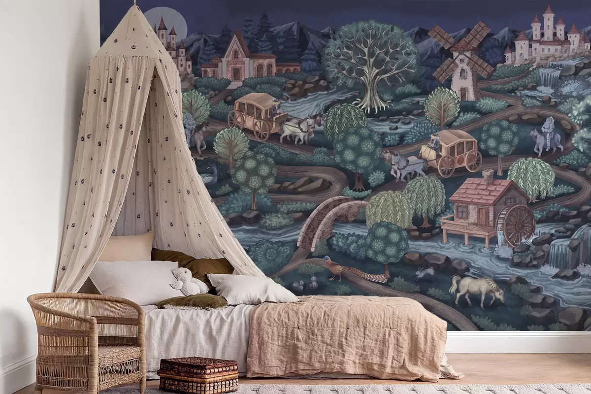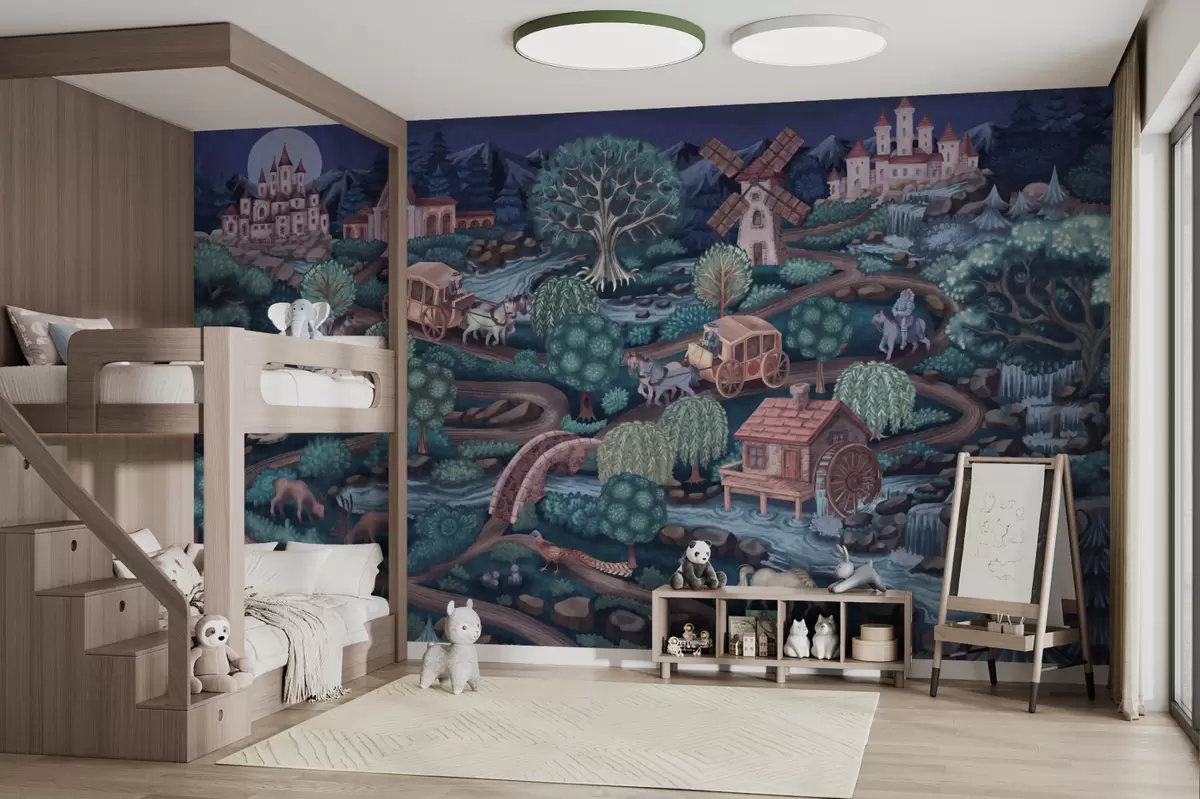 Фотошпалери Нічна казкова сцена із замками, млинами та лісом w05091