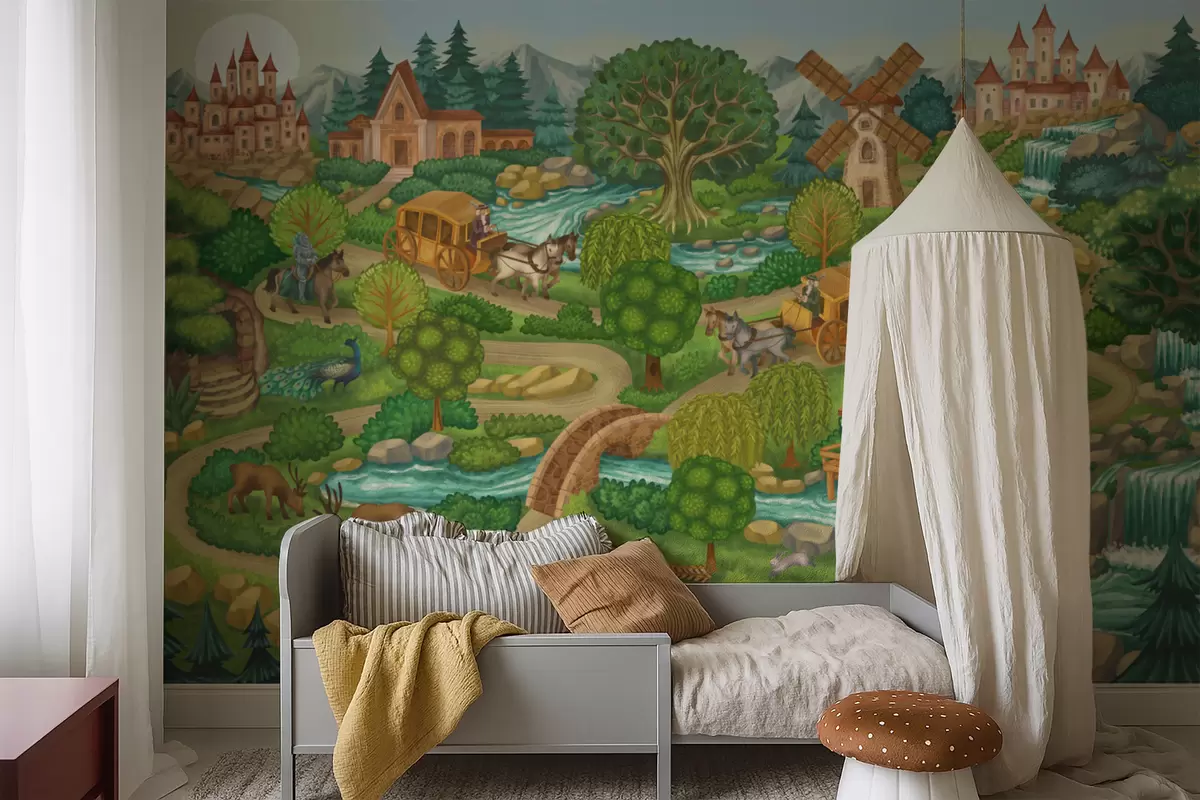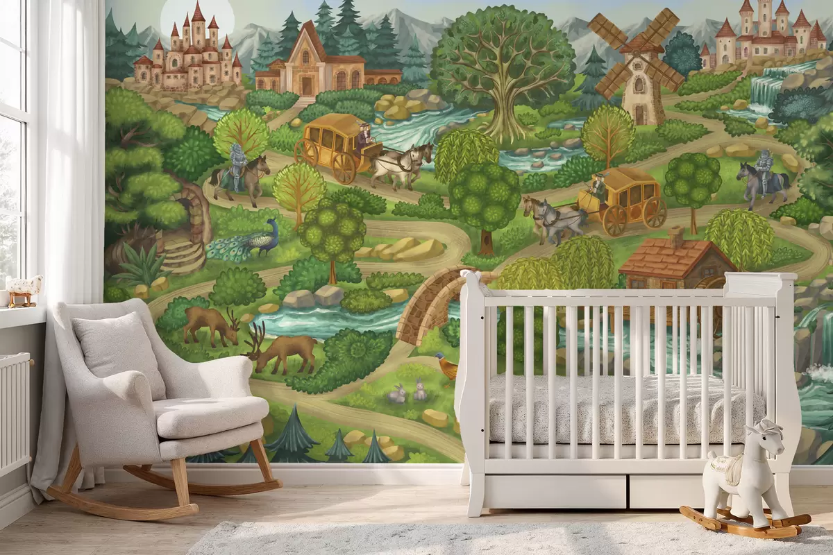 Фотошпалери Ілюстрація з казковими замками, лісами, річками та мандрівниками w05091v1