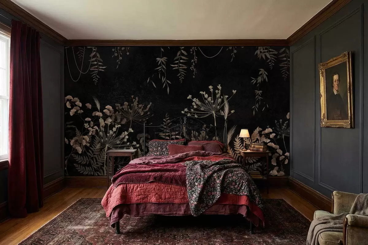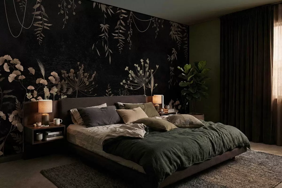 Фотошпалери Темний рослинний візерунок з квітами та листям w05092