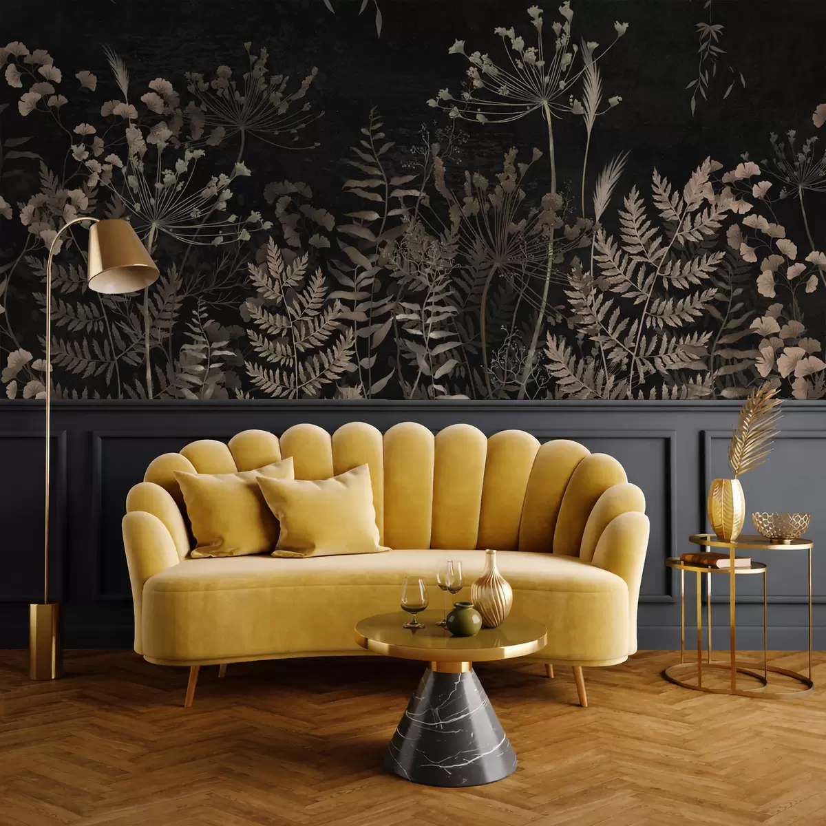 Фотошпалери Темний рослинний візерунок з квітами та листям w05092