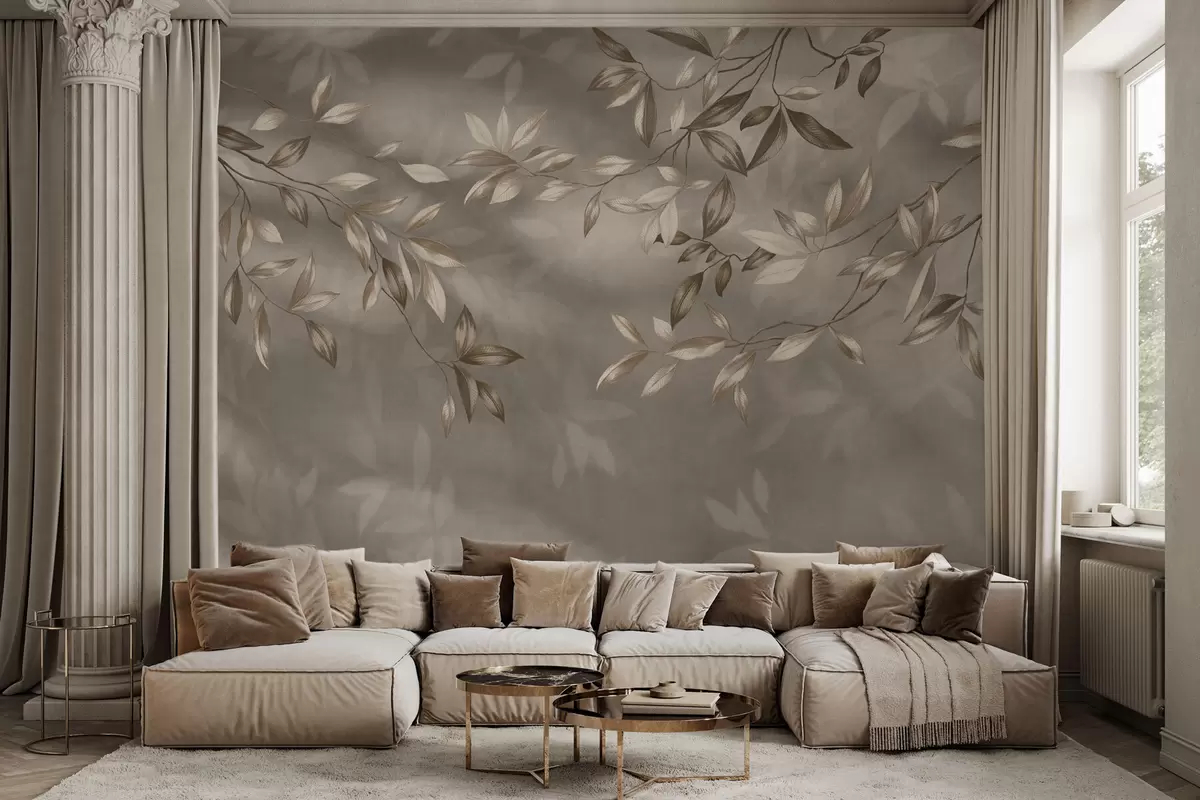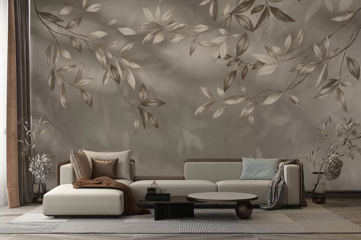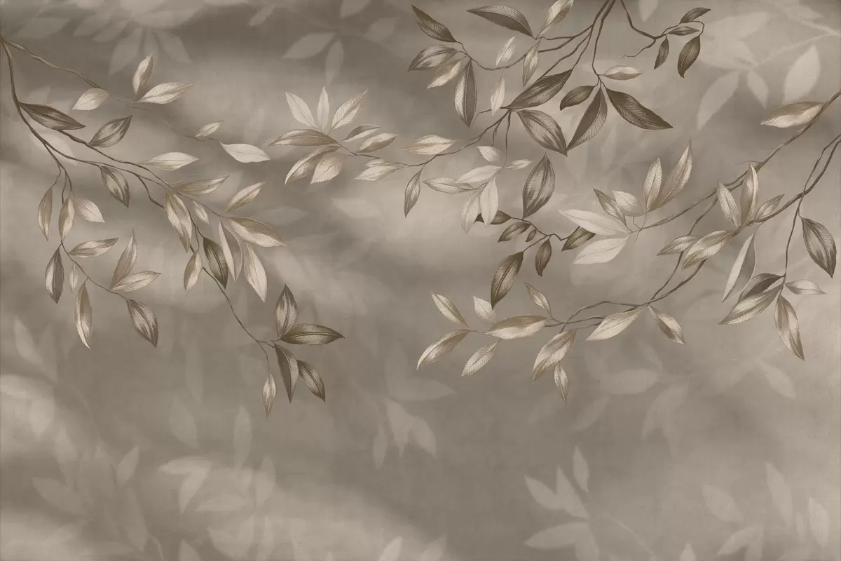 Фотошпалери Делікатні листяні гілки в бежевих тонах на світлому тлі w05113v2