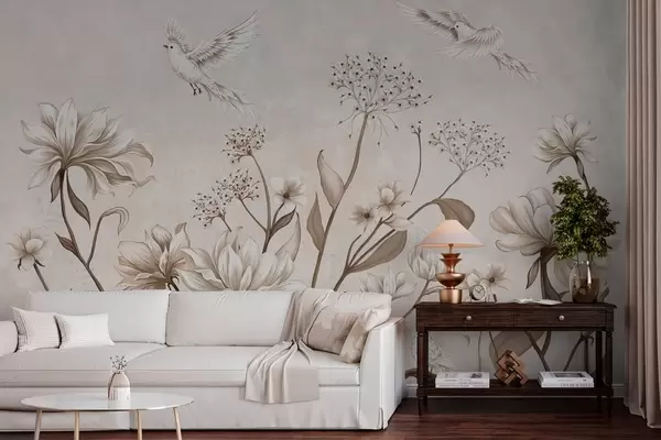 Фотошпалери Світлі квіти та птахи на м'якому тлі w05118