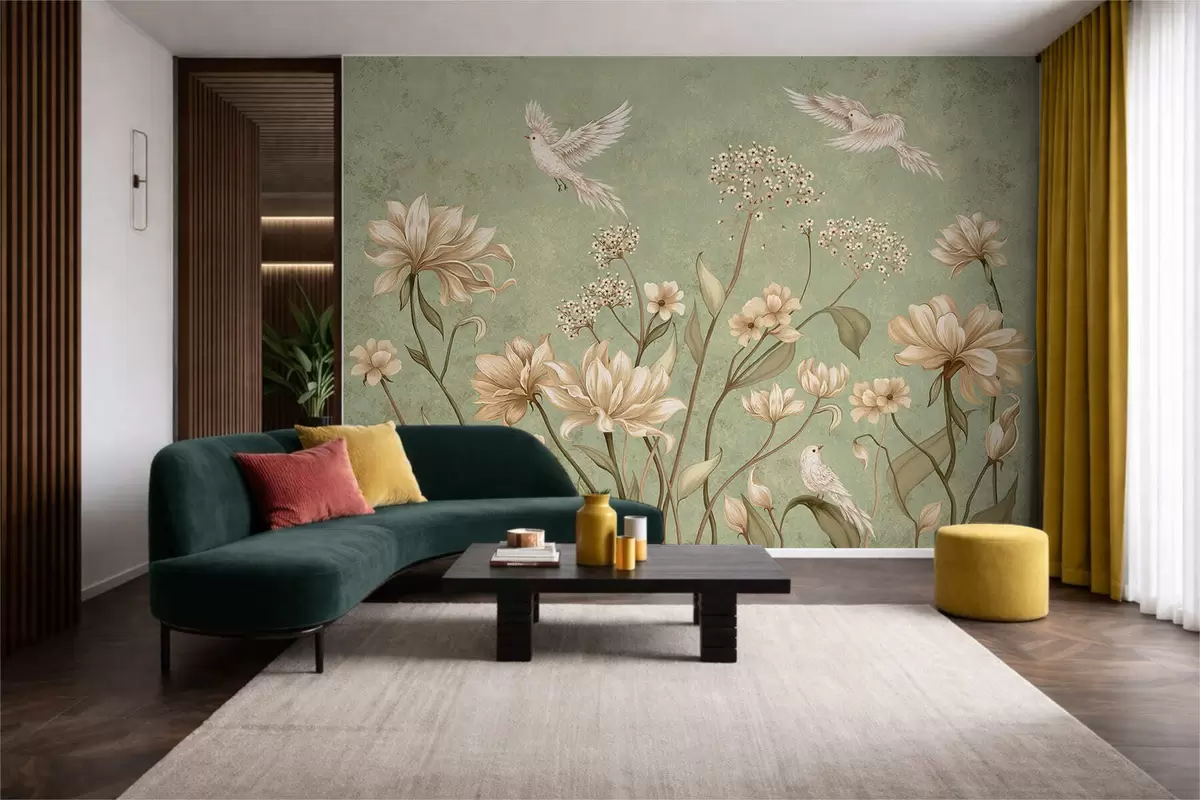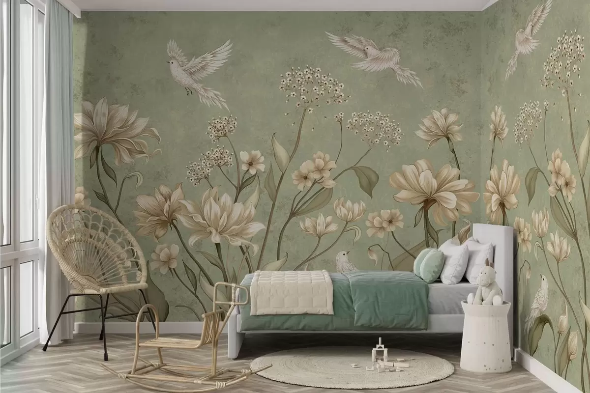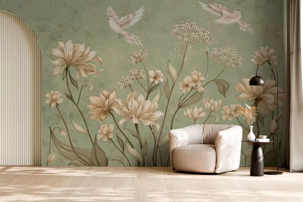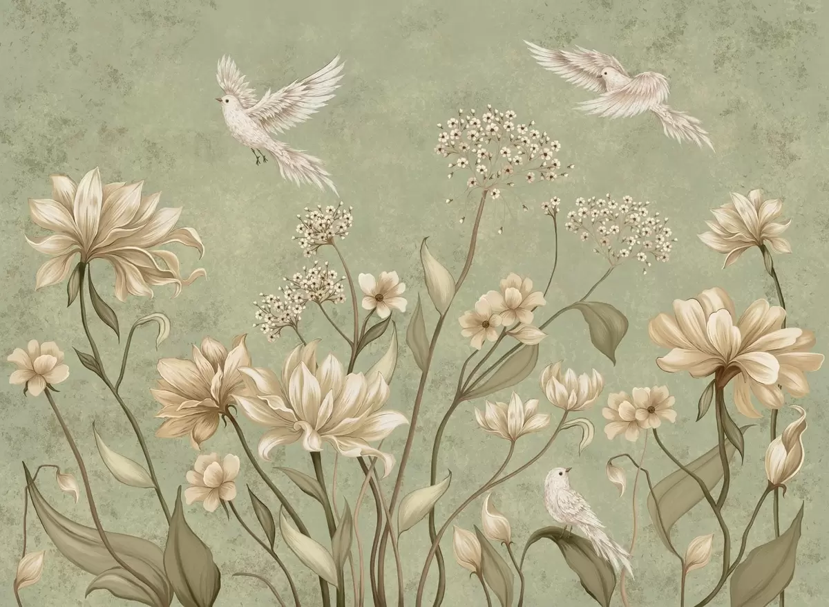 Фотошпалери Квіти та птахи на зеленому фактурному тлі w05118v1