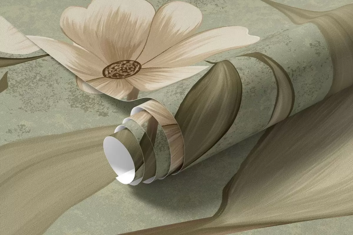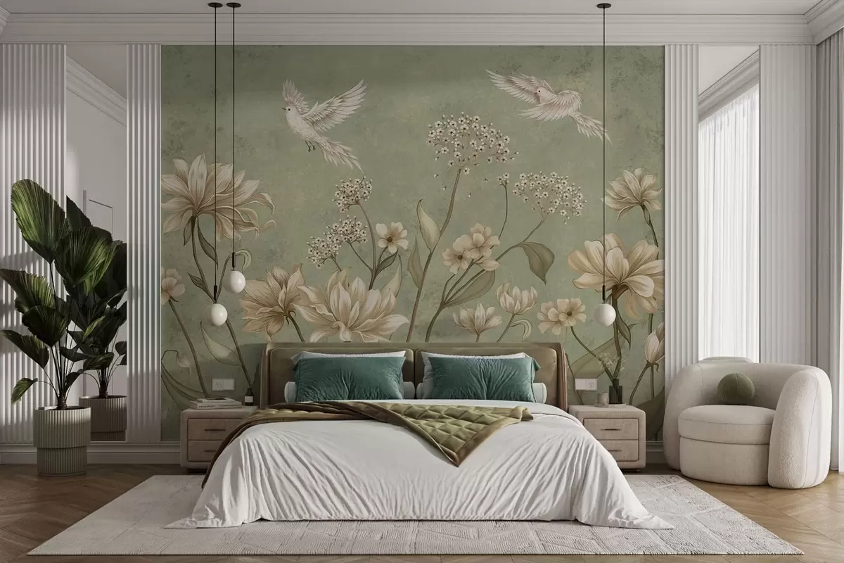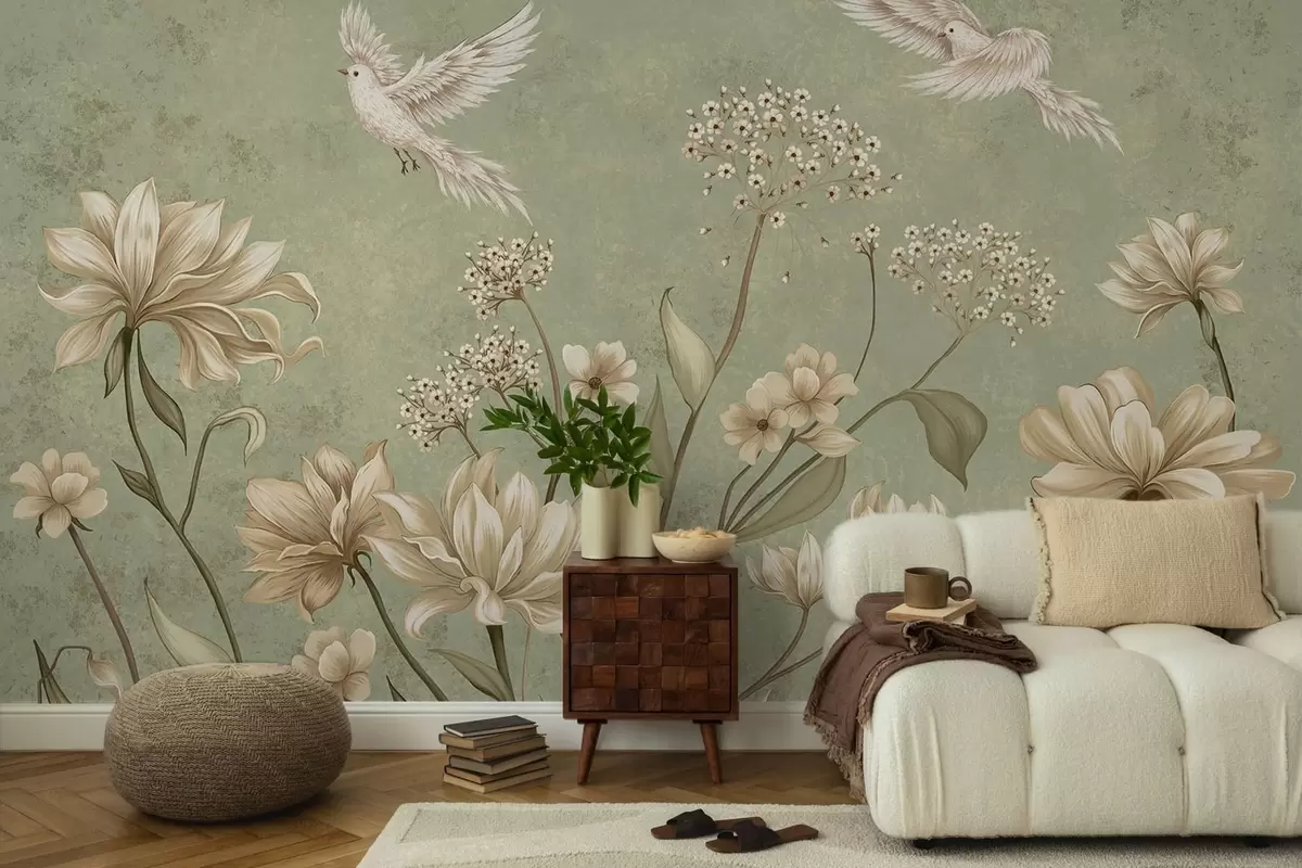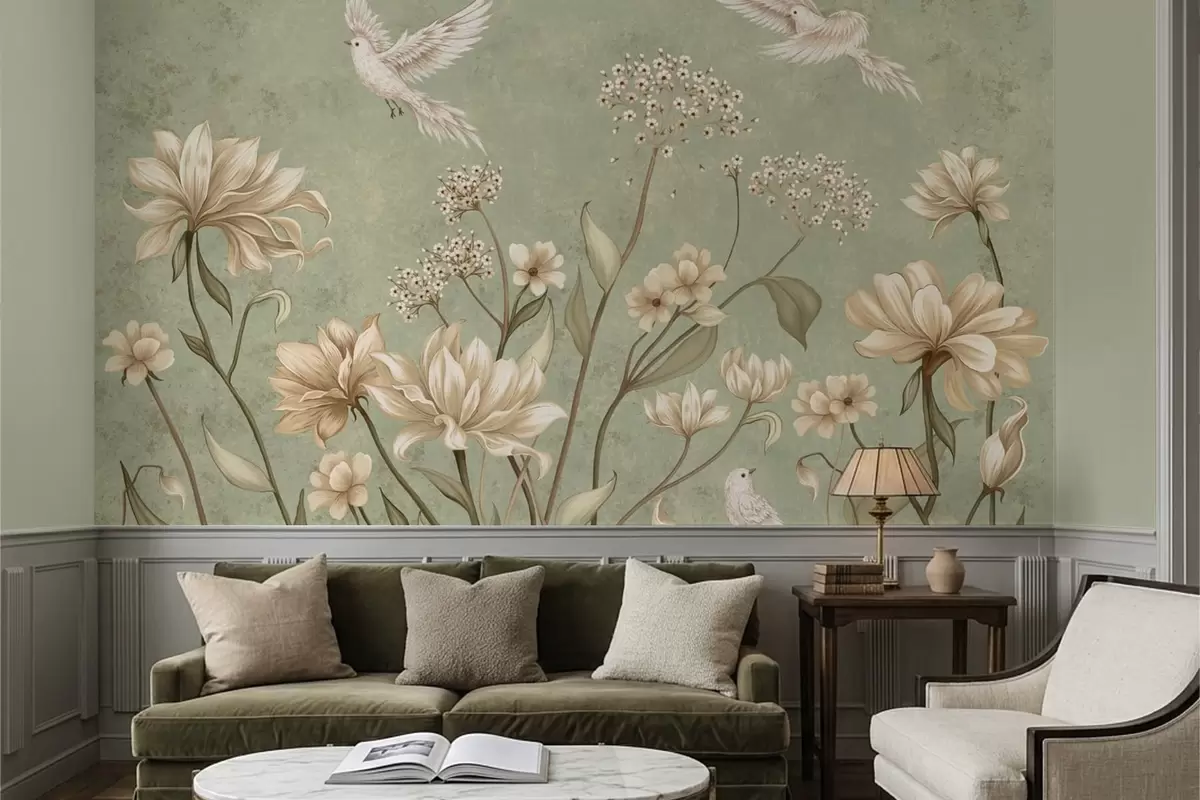 Фотошпалери Квіти та птахи на зеленому фактурному тлі w05118v1