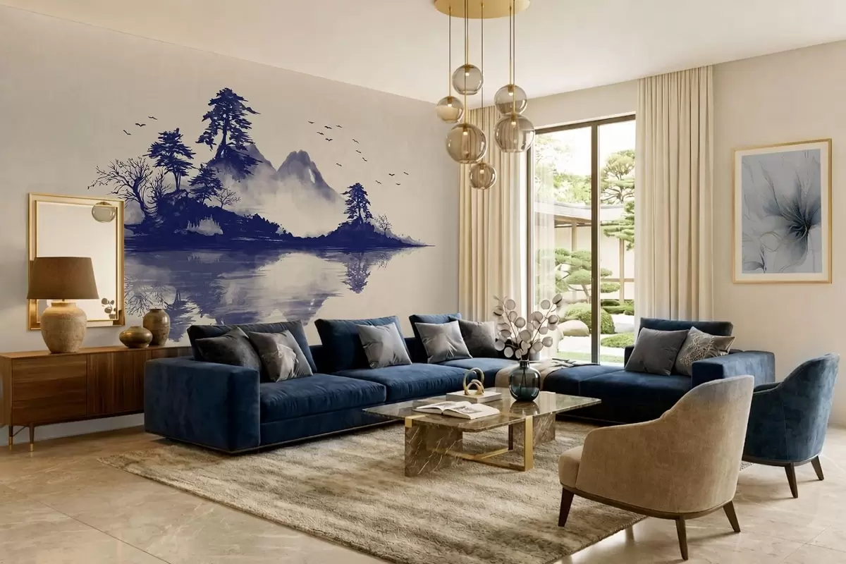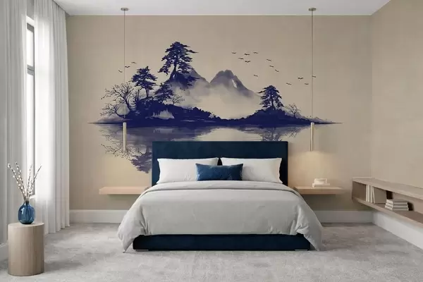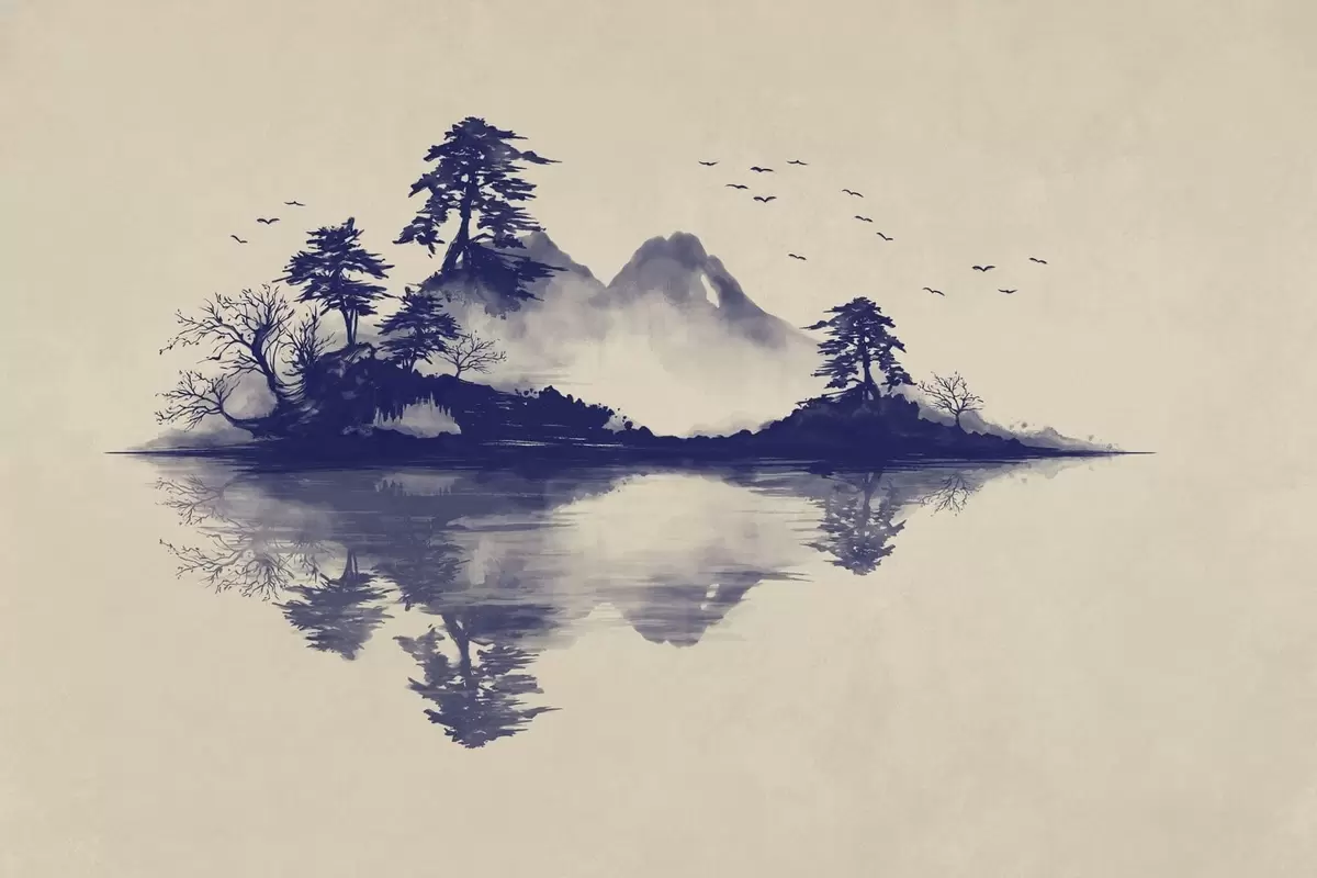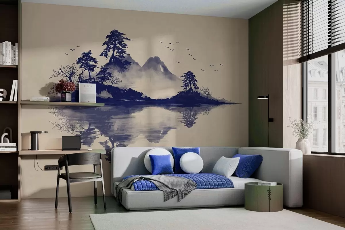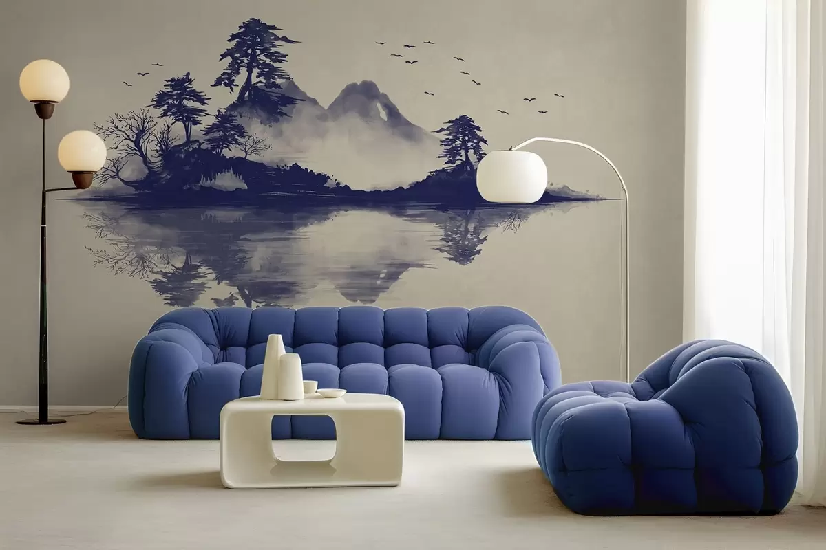 Фотошпалери Гірський пейзаж у техніці сумі-е у блакитних тонах w05124v2