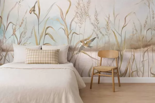 Фотошпалери Ілюстрація очерету і птахів біля води в м'яких тонах w05125
