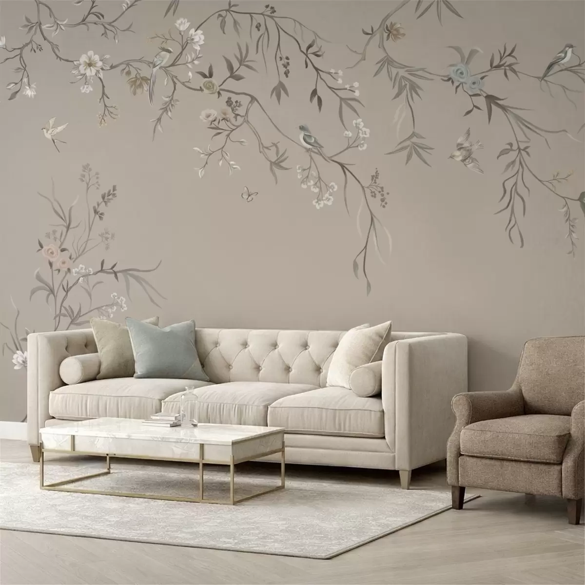 Фотошпалери Квітковий орнамент з птахами на нейтральному тлі w05127v3
