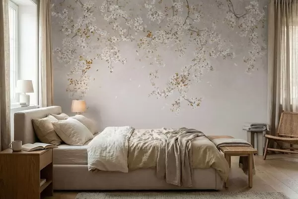 Фотошпалери Гілки з білими квітами на м'якому бежевому тлі w05129