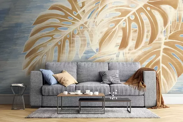 Фотошпалери Листя в світлих піщаних тонах на синьому тлі w05130v1
