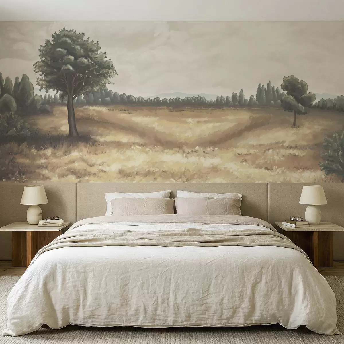Фотошпалери Намальований пейзаж з деревами та відкритим полем w05131
