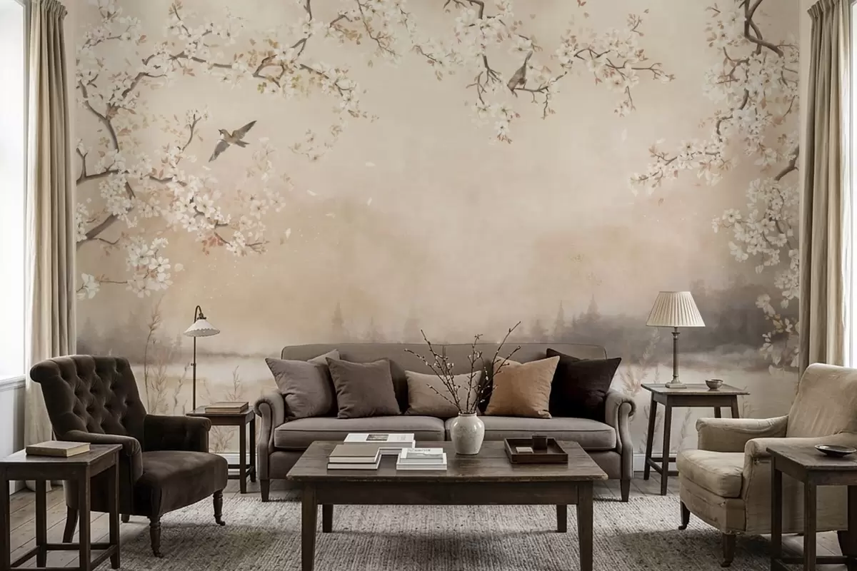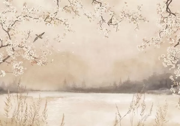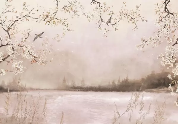 Фотошпалери Ніжні квітучі гілки біля озера з птахами в легкому тумані w05155