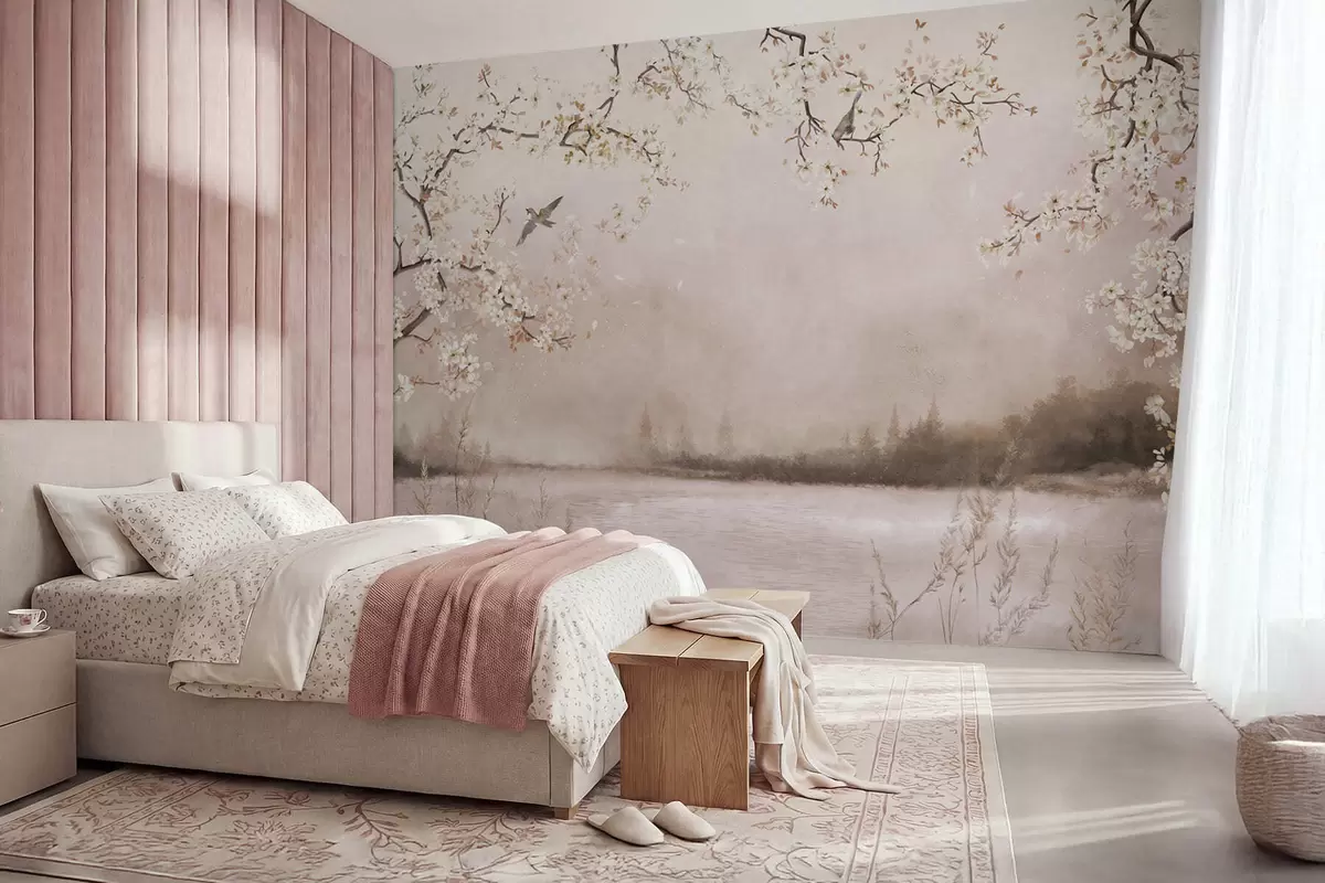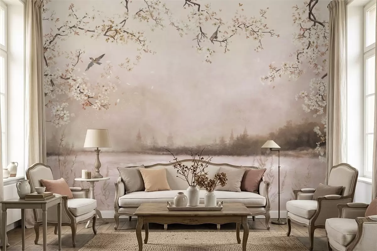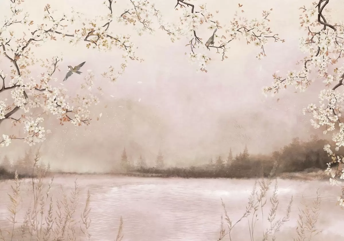 Фотошпалери Квітучі гілки над спокійним озером з птахами в тумані w05155v1