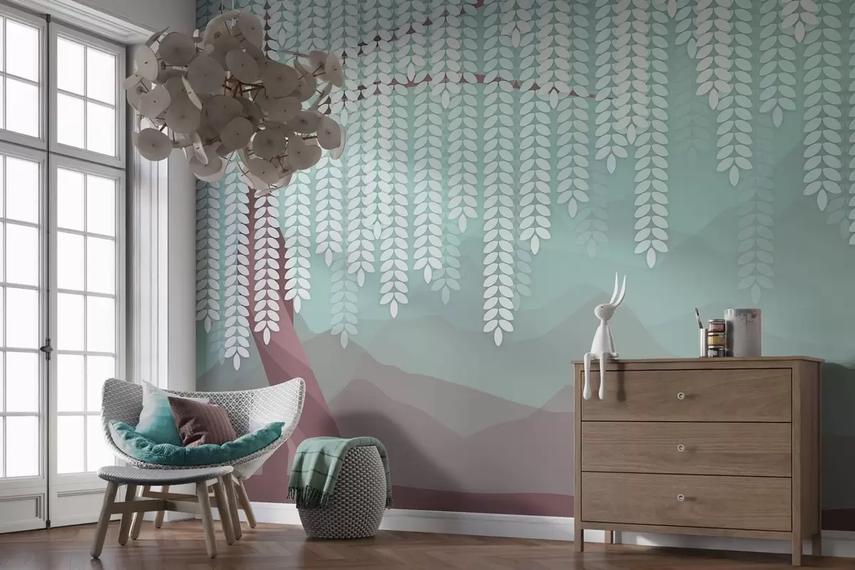 Фотошпалери стилізована верба з звисаючими листям на тлі мінімалістичних гір у відтінках шоколаду та бірюзи w05232v1