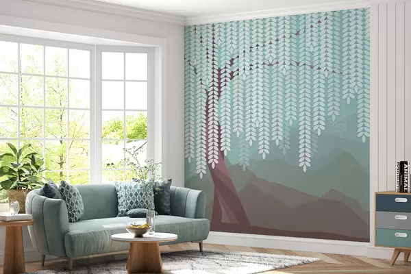Фотошпалери стилізована верба з звисаючими листям на тлі мінімалістичних гір у відтінках шоколаду та бірюзи w05232v1