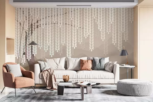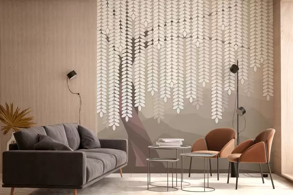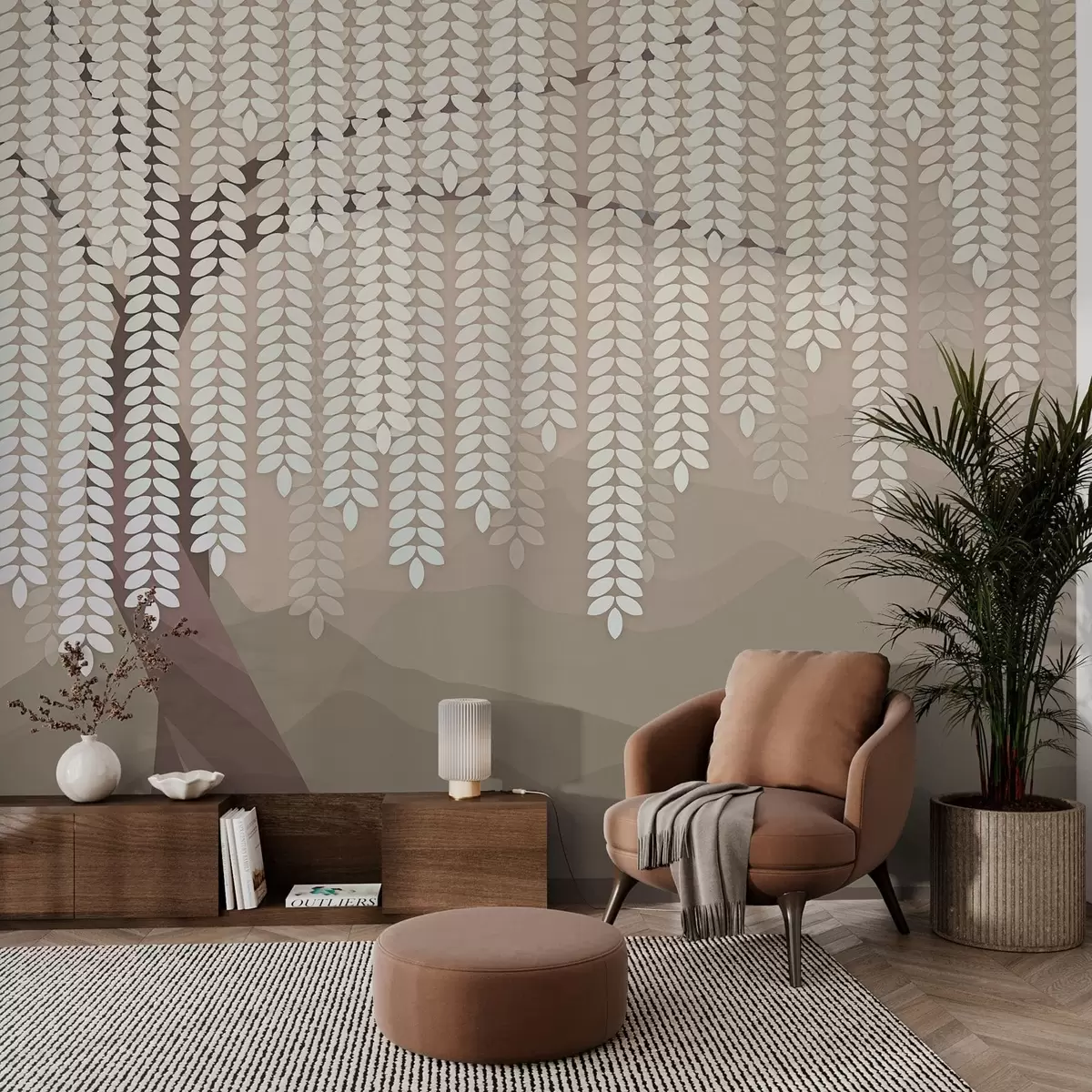 Фотошпалери стилізована верба з звисаючими листям на тлі мінімалістичних гір у відтінках кави w05232v2